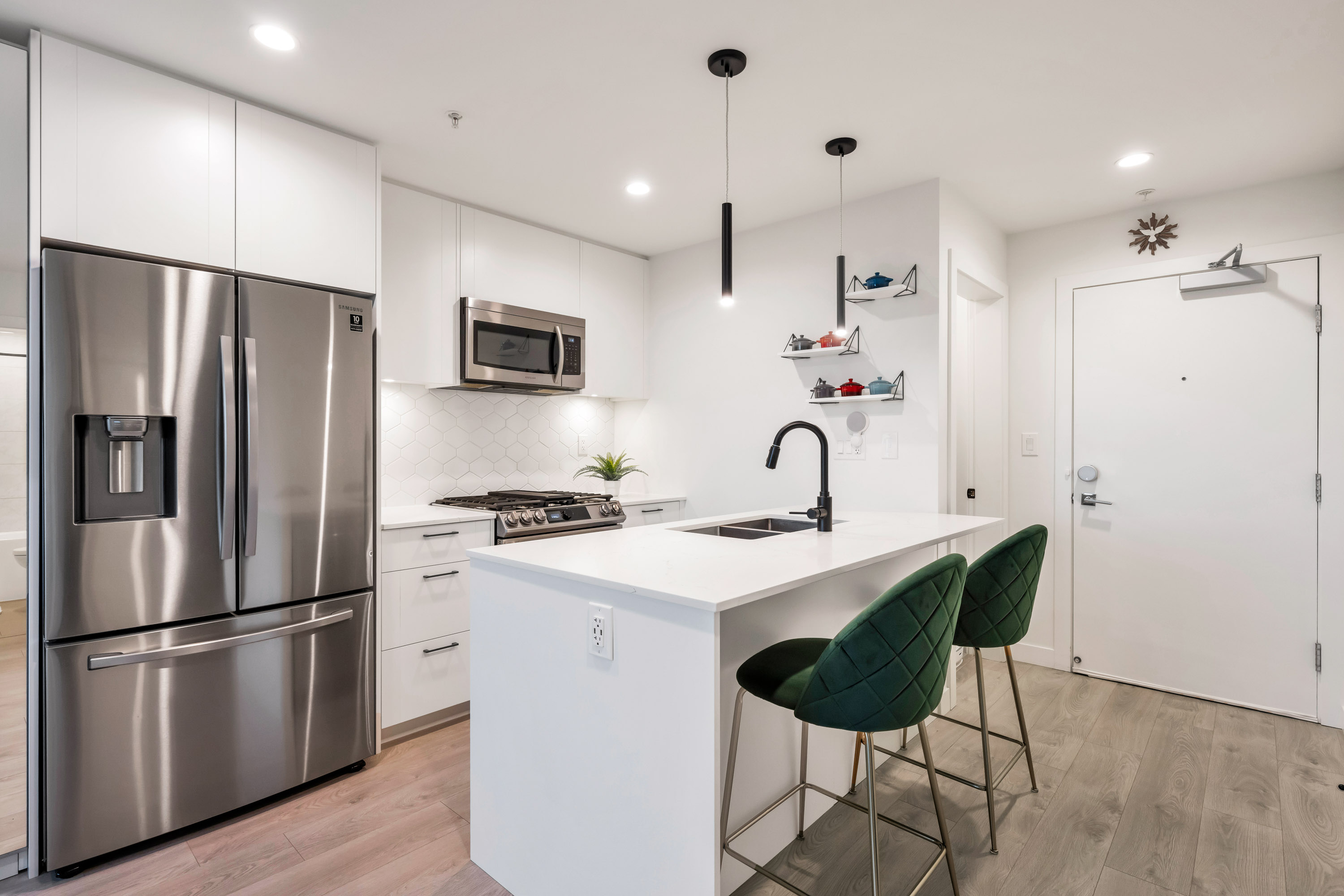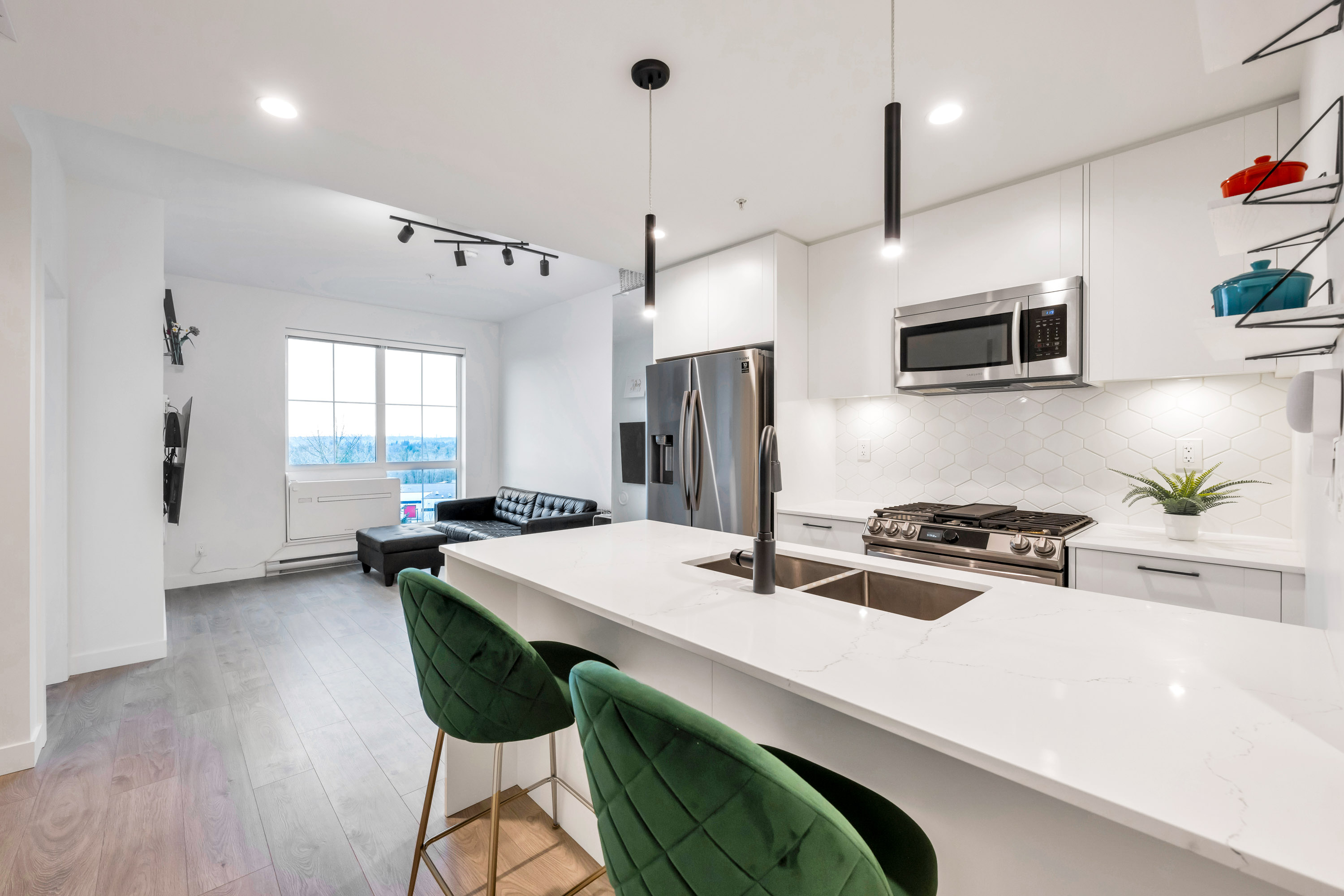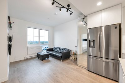 Gorgeous Top Floor 1 Bed Condo in Willoughby's master planned Latimer Village!! This beautiful, immaculately kept home features laminate wide plank flooring, quartz countertops, a gas range stove, 9 ft ceilings, upgraded Air Conditioning, remote roller blinds, stainless steel appliances, and located on the penthouse level with mountain views & no neighbours above you!! This vibrant community has trendy restaurants, local coffee shops, Blacksmith Bakery, dentist, salons, barbershop, spas, and much more right here! Close to Schools, Parks, and HWY 1 for added convenience!! Gas included in strata fees for those who love to cook! Also includes 1 parking & 1 large storage locker. *Call to schedule your viewing today!