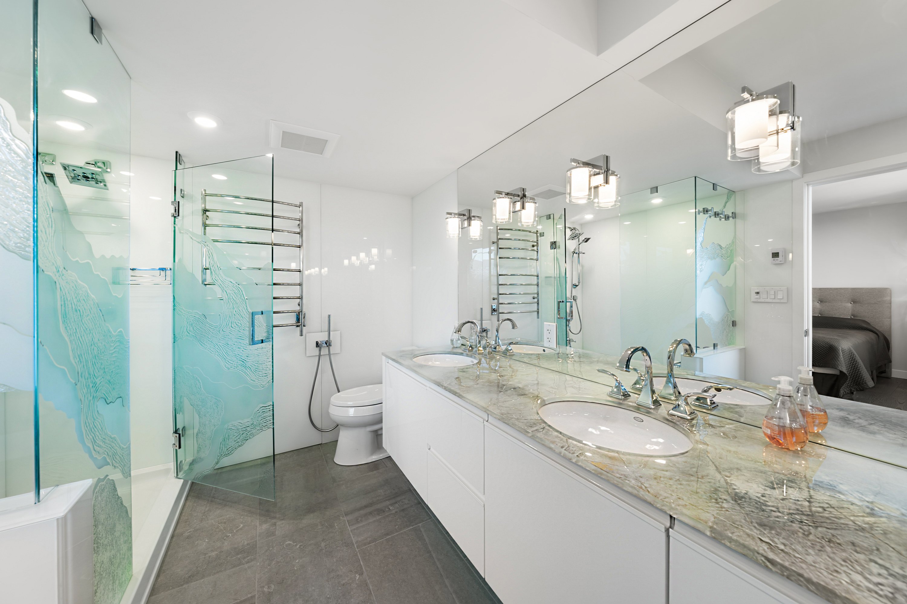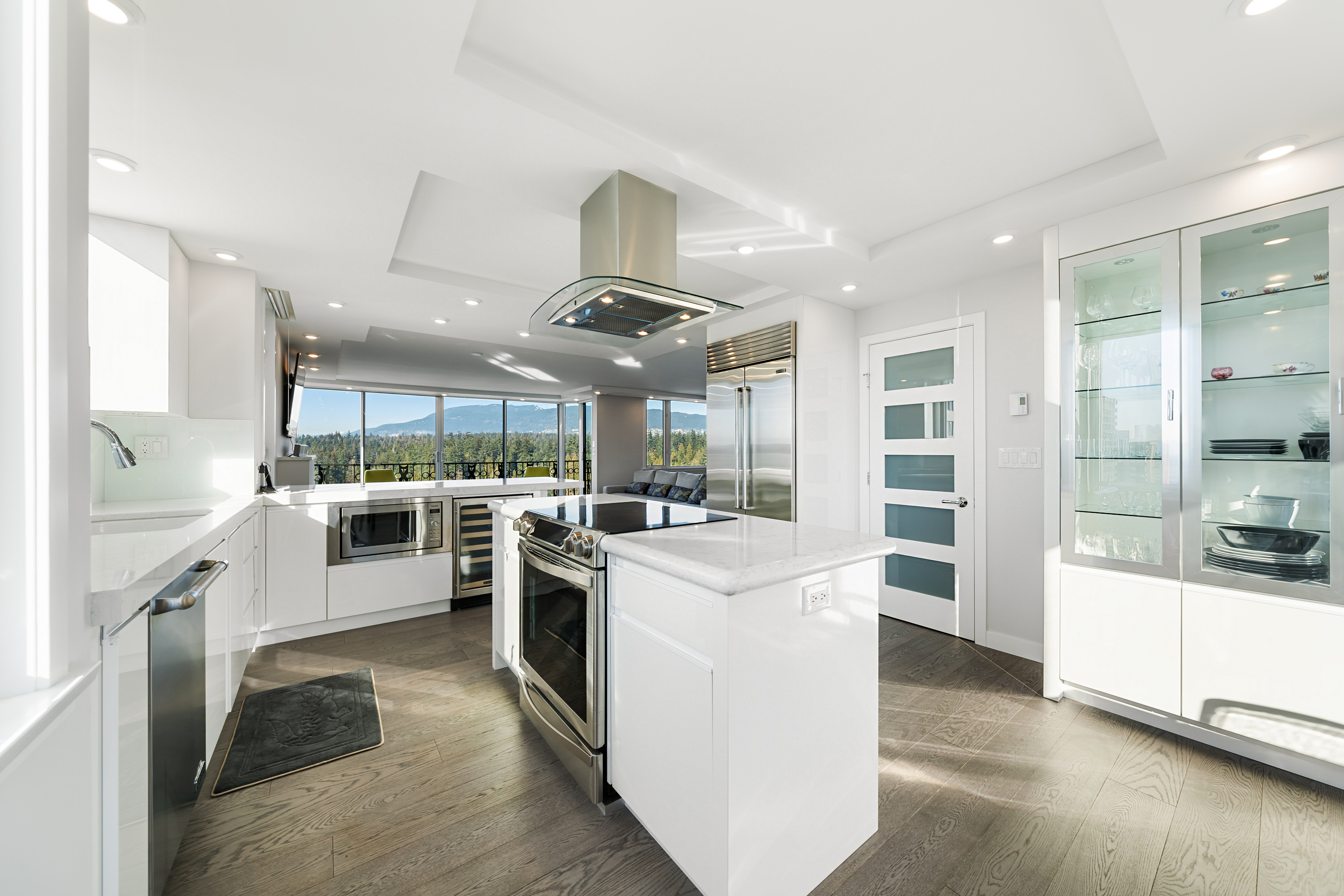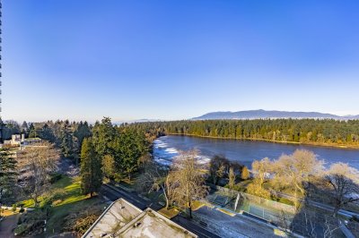 A stunning full floor residence at Lagoon Terrace is available on the market! This 3 bedroom, 2 bathroom home is perched above Lost Lagoon, offering breathtaking panoramic views of English Bay, the North Shore Mountain and Stanley Park The unit has been totally updated with no expense spared, featuring a kitchen with a high end appliances and a sub Zero fridge, spa inspired bathrooms with bathroom heated floors ,power blinds and beautiful hardwood floors throughout. The expansive living & dining areas are bathed in natural light, creating an open and airy atmosphere with unparalleled privacy, as the suite occupies the entire 10th floor with a private secure elevator entry. A rare find in the urban market! Includes 2 parking stalls in the underground parkade and a storage locker.