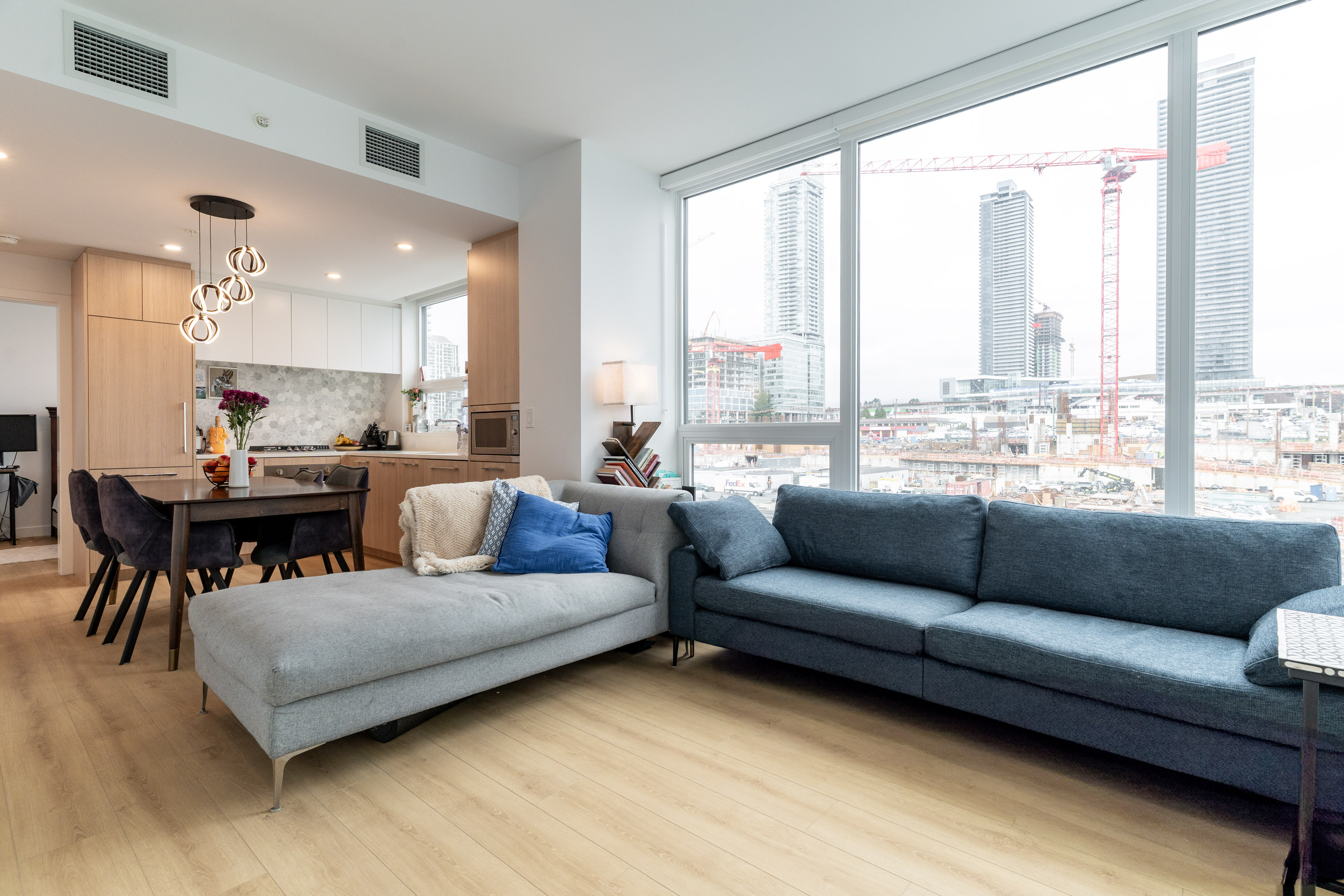 Experience luxury living at TAILOR BY MARCON, nestled in the heart of Brentwood. This spacious 1BED/1BATH 648 SQ FOOT home features city-view windows, quartz counters, premium S/S Bosch appliances, sleek laminate flooring, 9' ceilings and ensuite bathroom to the bedroom with walkthrough closet. The high-efficiency heating and air conditioning system ensures comfort year-round. Enjoy BBQs and tranquil mountain views from the large patio. Steps away from the Skytrain station, easy access to hwy and Brentwood Mall. The building boasts premium amenities including a fully equipped fitness centre, yoga/stretch room, a lounge with a co-working area, and a dog run/wash station. Comes with 1 parking, 1 storage.