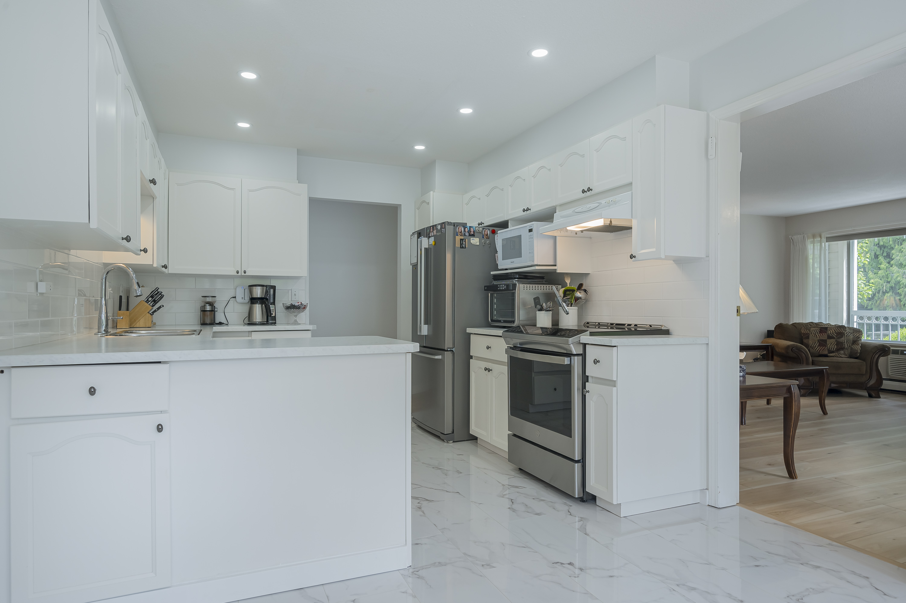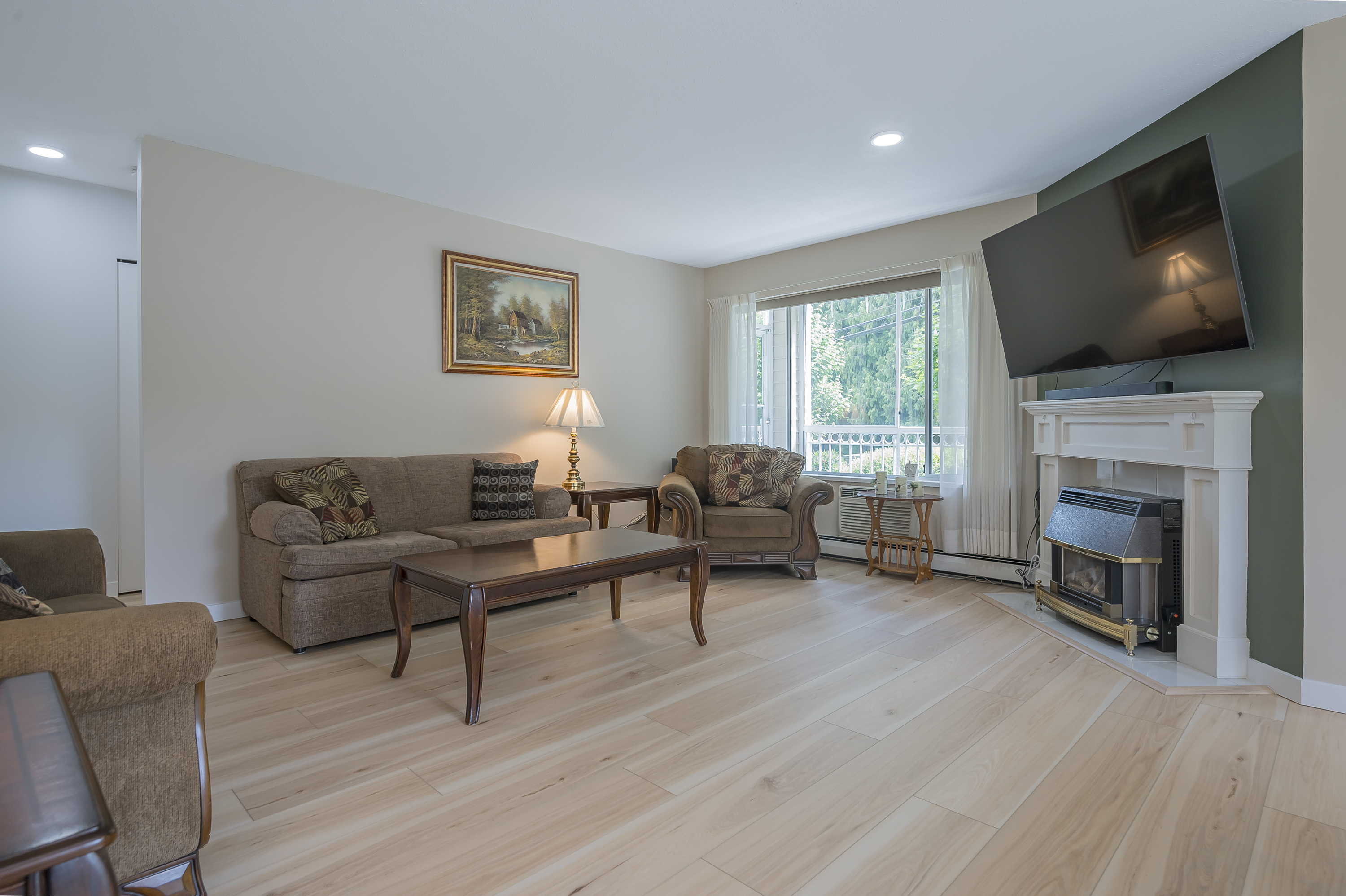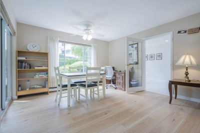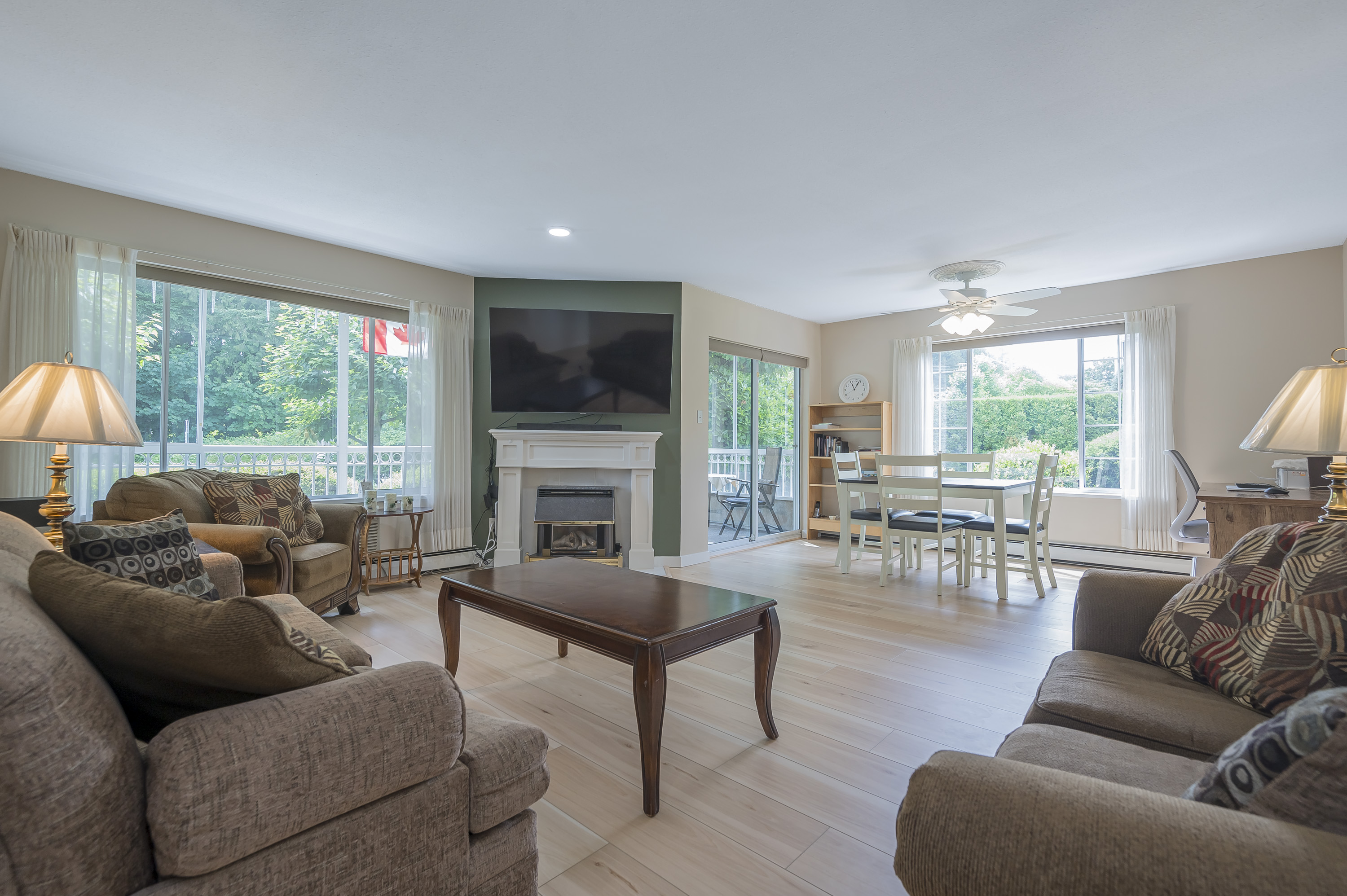 Beautifully renovated HUGE corner unit in the sought-after 55+ community of Lakewood Gardens with an exceptionally maintained strata just steps from Mill Lake and close to shopping,transit and all amenities.This bright and spacious 2 bedroom, 2 bathroom home features numerous modern updates including new flooring,updated kitchen and bathrooms,contemporary lighting, fresh paint and newer appliances including washer and dryer.Enjoy the enclosed solarium year-round or relax by your cozy gas fireplace in your spacious living room.Building amenities include a fitness room, workshop, library, community lounge,and guest suite.HOT WATER HEAT AND GAS FIREPLACE INCLUDED IN STRATA FEE. .1 parking ,1 storage locker. Bonus additional storage cabinet in workshop.Pets not allowed. Not a ground level unit