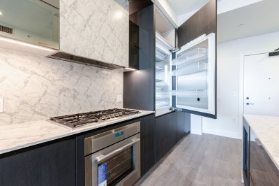 Monaco, White Rock's newest and most prestigious high rise. Ocean View home has it all from 18' gourmet kitchen featuring Thermador. Built in appliances from the fridge, cooktop, wine fridge, microwave, and oven. Cabinets feature pull outs everywhere. Master suite is large with massive closet space and more built ins. Ensuite is tiled to the ceiling, recessed mirrors, shelving, bidet, and heated floors. Flex space could be set up as a dining room or 3rd bedroom. Secondary bedroom is bright large and has loads of closet space. 2 Parking spaces (one with EV roughed in) storage locker. Air conditioned and ready to move in. There are 2 common social areas for entertaining a complete lounge area with kitchen and a 5th floor outdoor oasis including BBQ and Panoramic Views. Awesome gym as well.