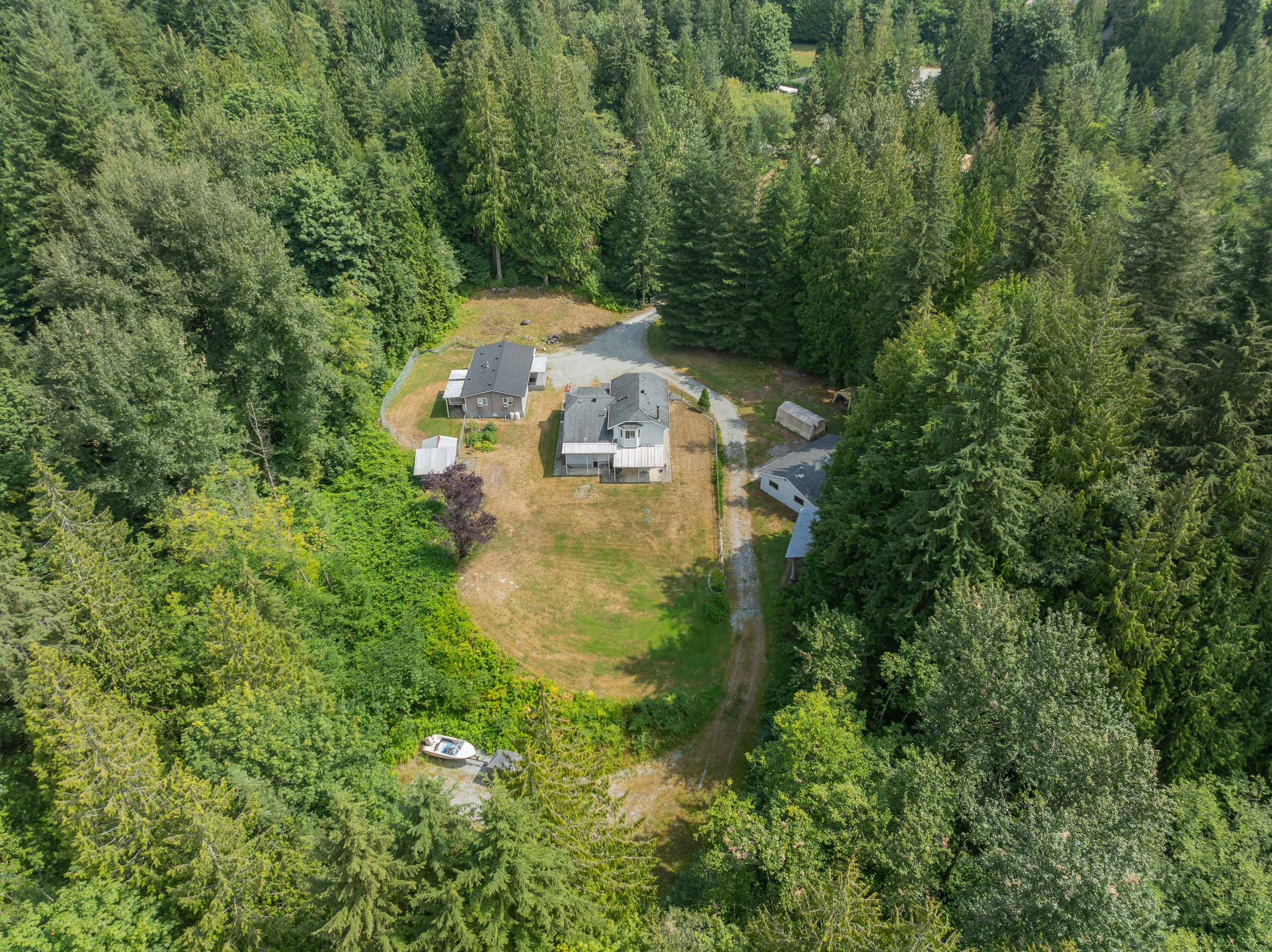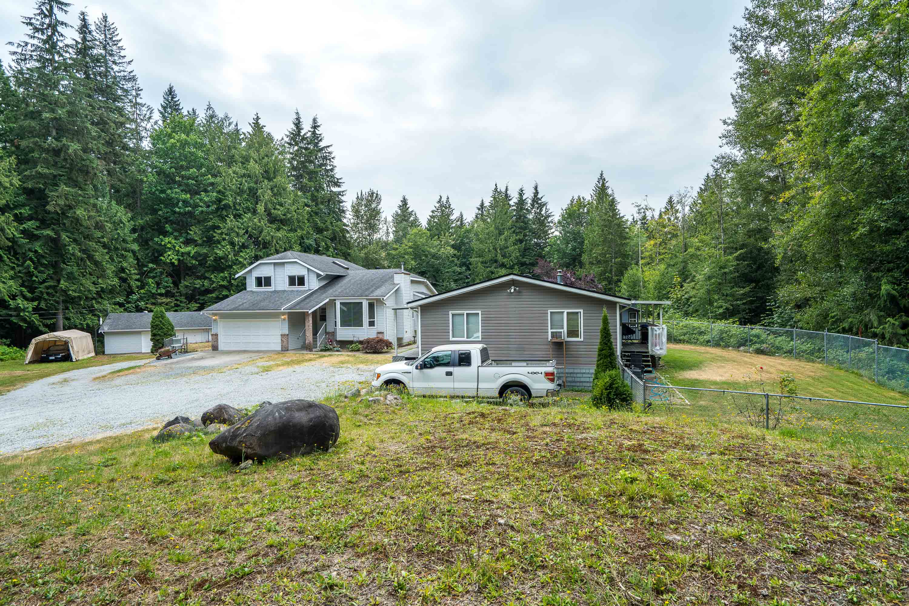 2 HOUSES& SHOP!! Drive down the long private driveway, over the bridge, & you will be welcomed by a beautifully maintained, 1-owner home! This four-level split entry home, with basement, offers four bedrooms and three bathrooms, all enhanced by fresh upgrades. Roof is 13 years old, hot water tank & plumbing are brand new. Inside, you will discover stunning new flooring and vibrant fresh paint. New Septic field installed. For car enthusiasts, a spacious detached shop measuring 20 x 38 feet, 5 Acres allows for generous storage for RVs and boats. Additionally, the property boasts a secondary residence featuring Vaulted ceilings,3 bedrooms, 1 bathroom, 1 Year New Roof, Separate fenced yard. This custom modular home is perfect for extended family.