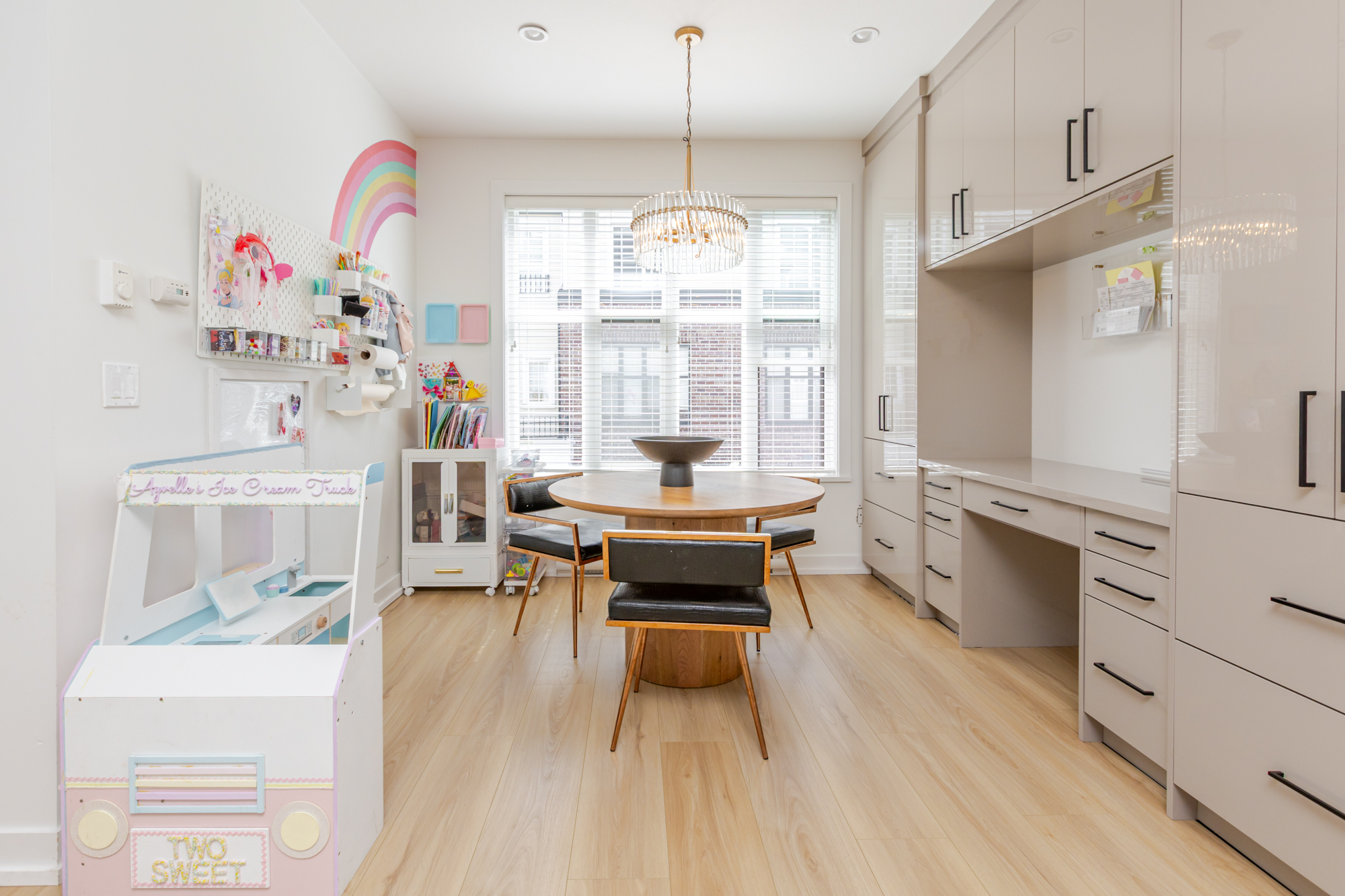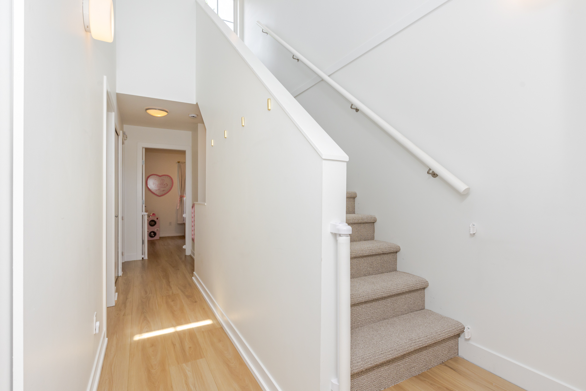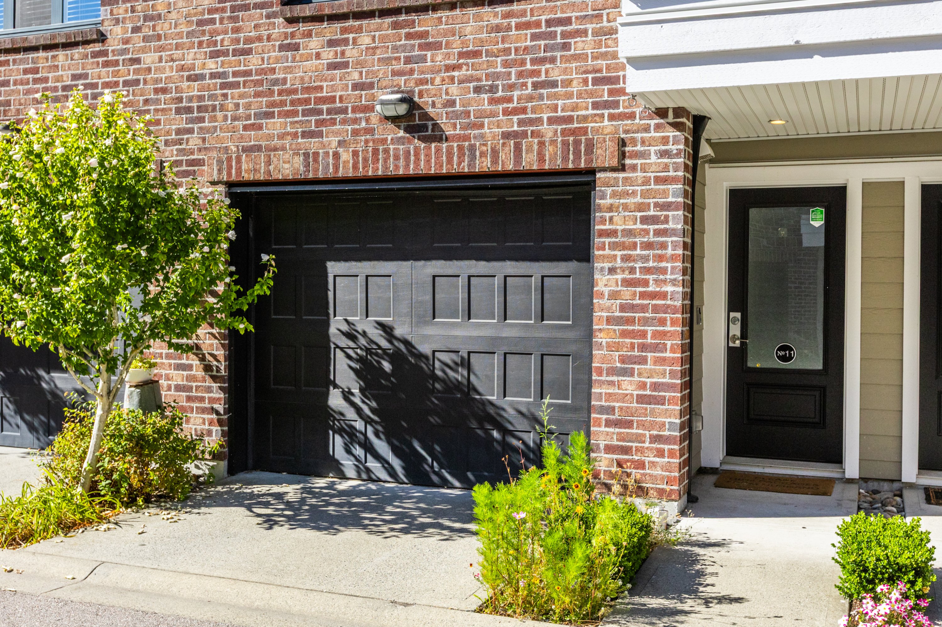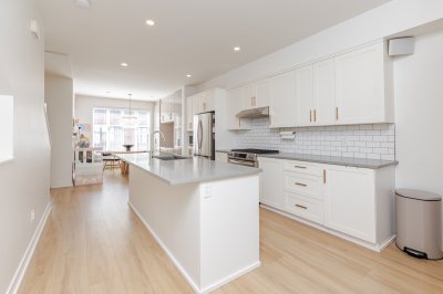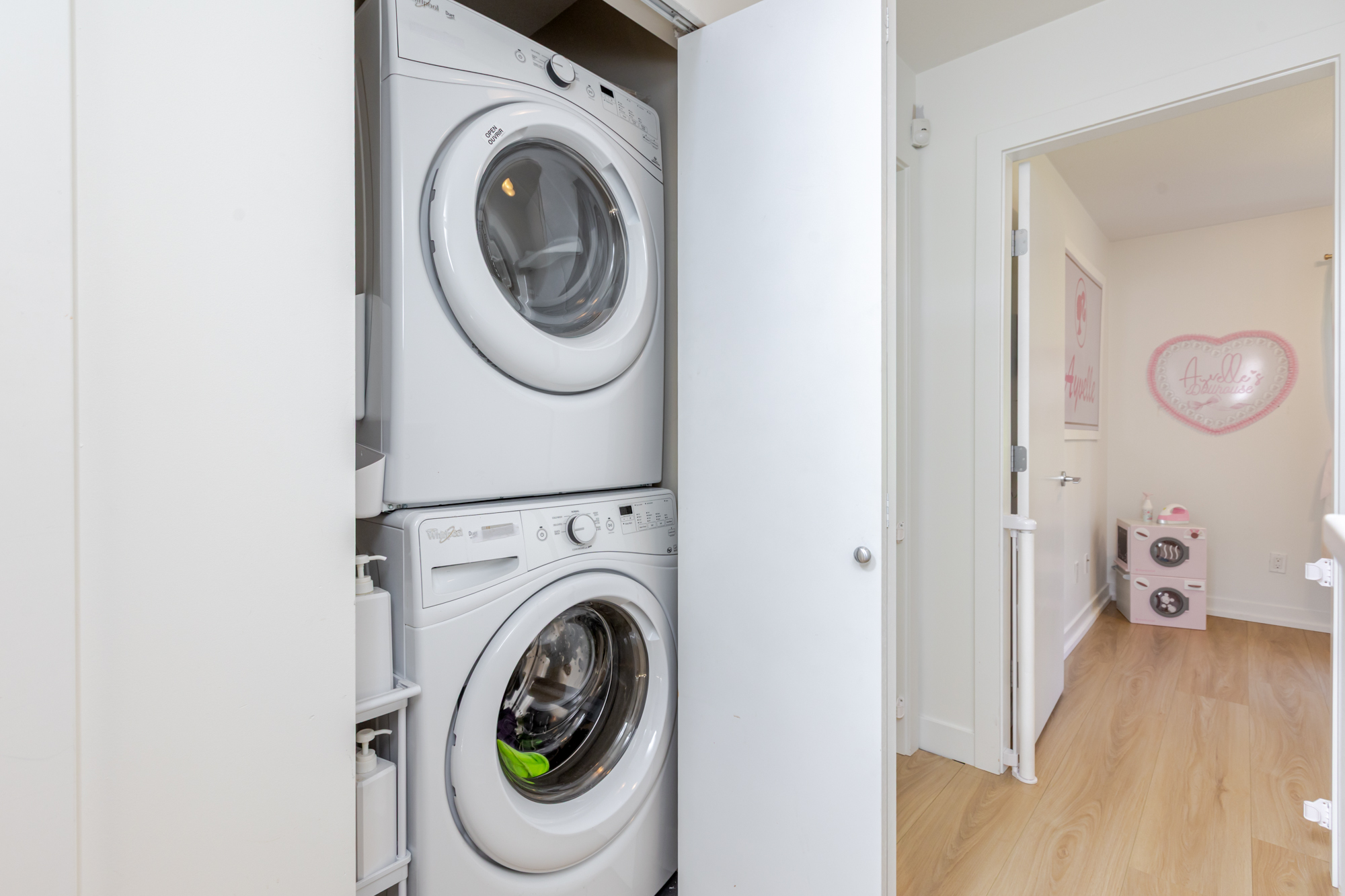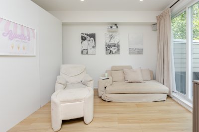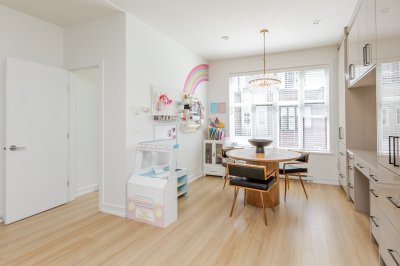 Welcome to THE WOODS — an immaculate, move-in-ready residence that blends modern elegance with family comfort. This stunning 3-bedroom, 2-bath + den townhome offers an open-concept main floor with a spacious island, quartz countertops, and premium stainless steel appliances. Custom millwork, new flooring (2024), and a built-in projector screen add both sophistication and comfort, while the expansive rooftop deck is perfect for entertaining.The walk-out den off the tandem garage opens directly onto tranquil greenspace, ideal for a home office, studio, or playroom. Nestled in a family-friendly community, this private yet connected location offers easy access to parks, shops, schools, and Highway 99 - the perfect setting for modern family living.