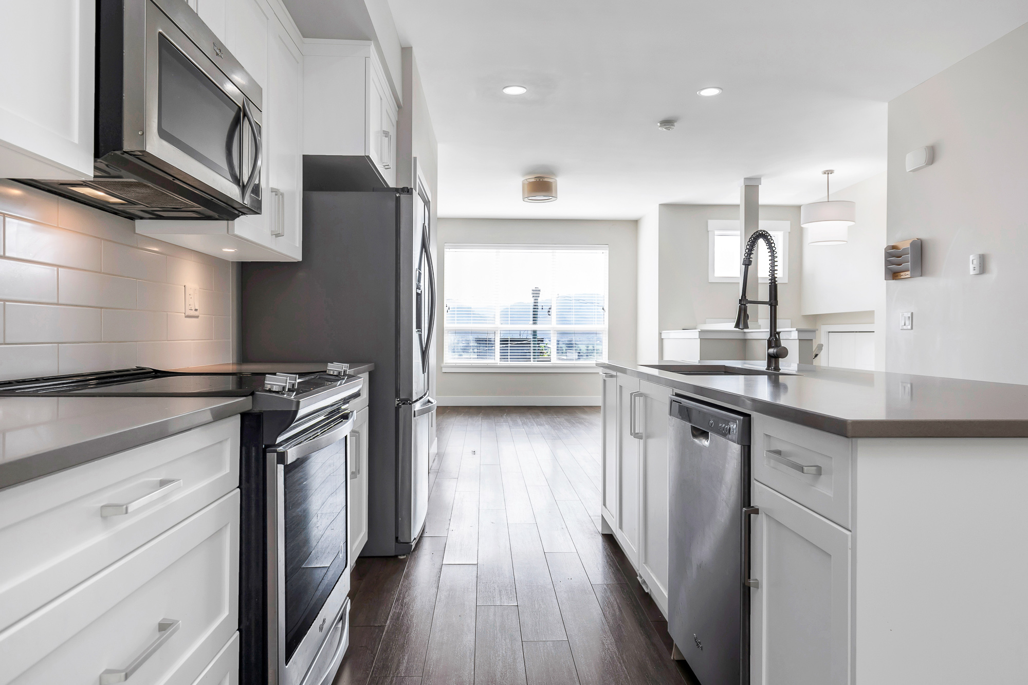VIEWS!! Fantastic END UNIT 3 Bed & 3 Bath, 3 storey in EAST Abbotsford. Open concept living space, large windows & high ceilings. A spacious dining & living room area leads onto a private & fenced backyard. Modern kitchen w/oversized island, quartz counters and Stainless appliances. The Primary Bdrm has a ensuite & deck to enjoy gorgeous views of the Mt Bake & the Valley. Tandem garage and parking for full size vehicle outside, 18' x 13'2 flex/office space finished for extra space down. Excellent location, minutes away from Shopping, Starbucks, Timmy's and quick access to Hwy #1.