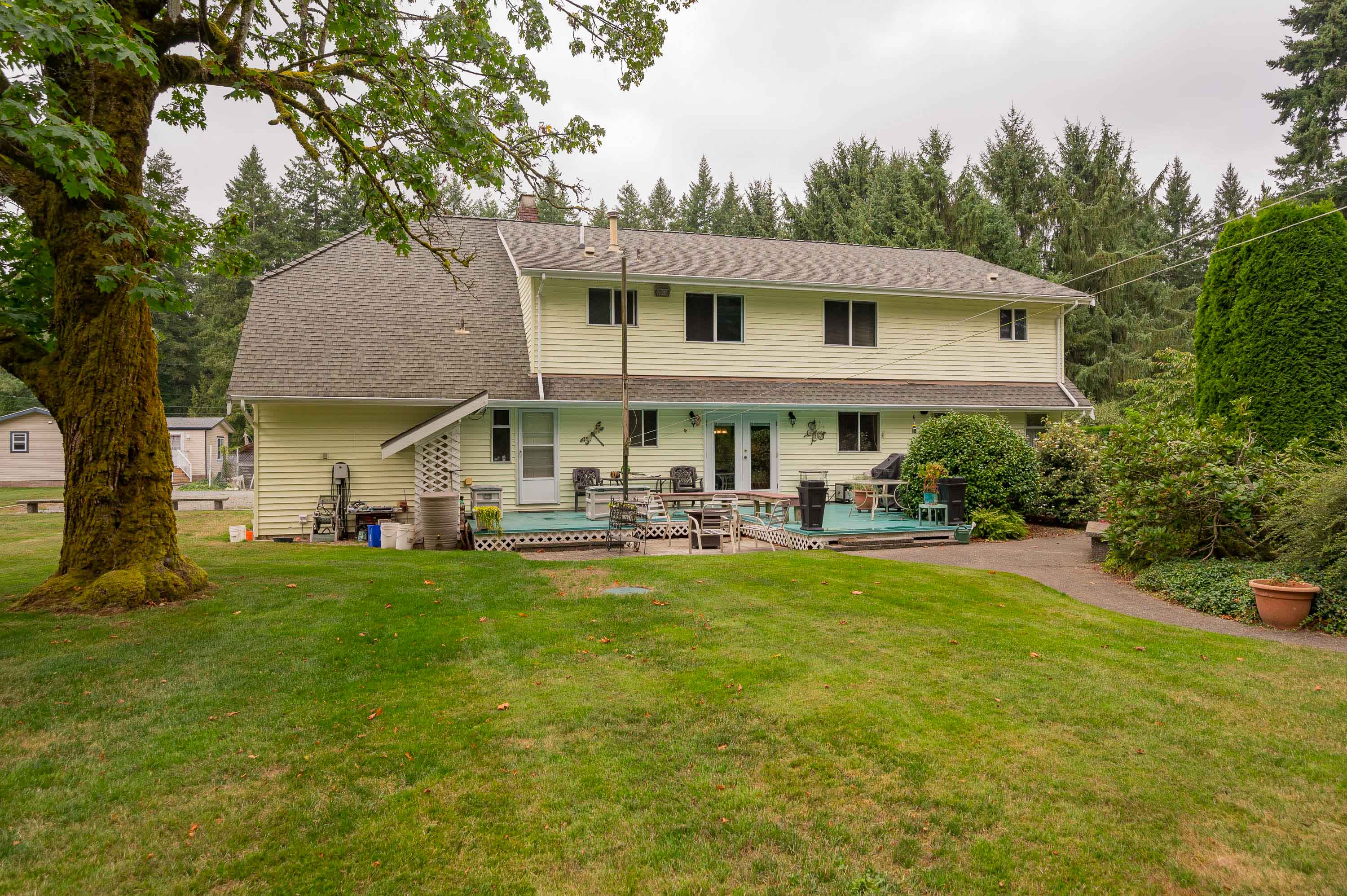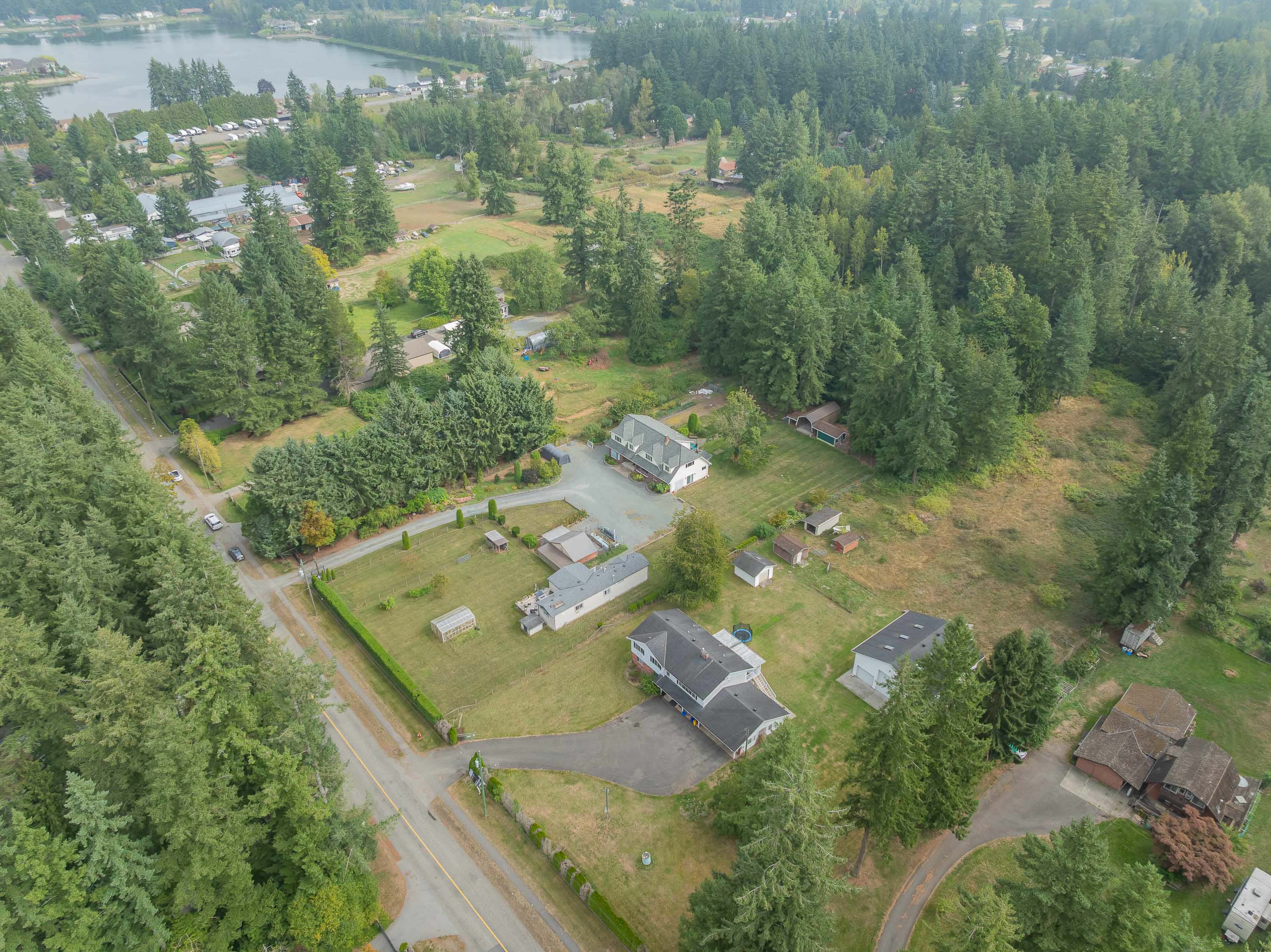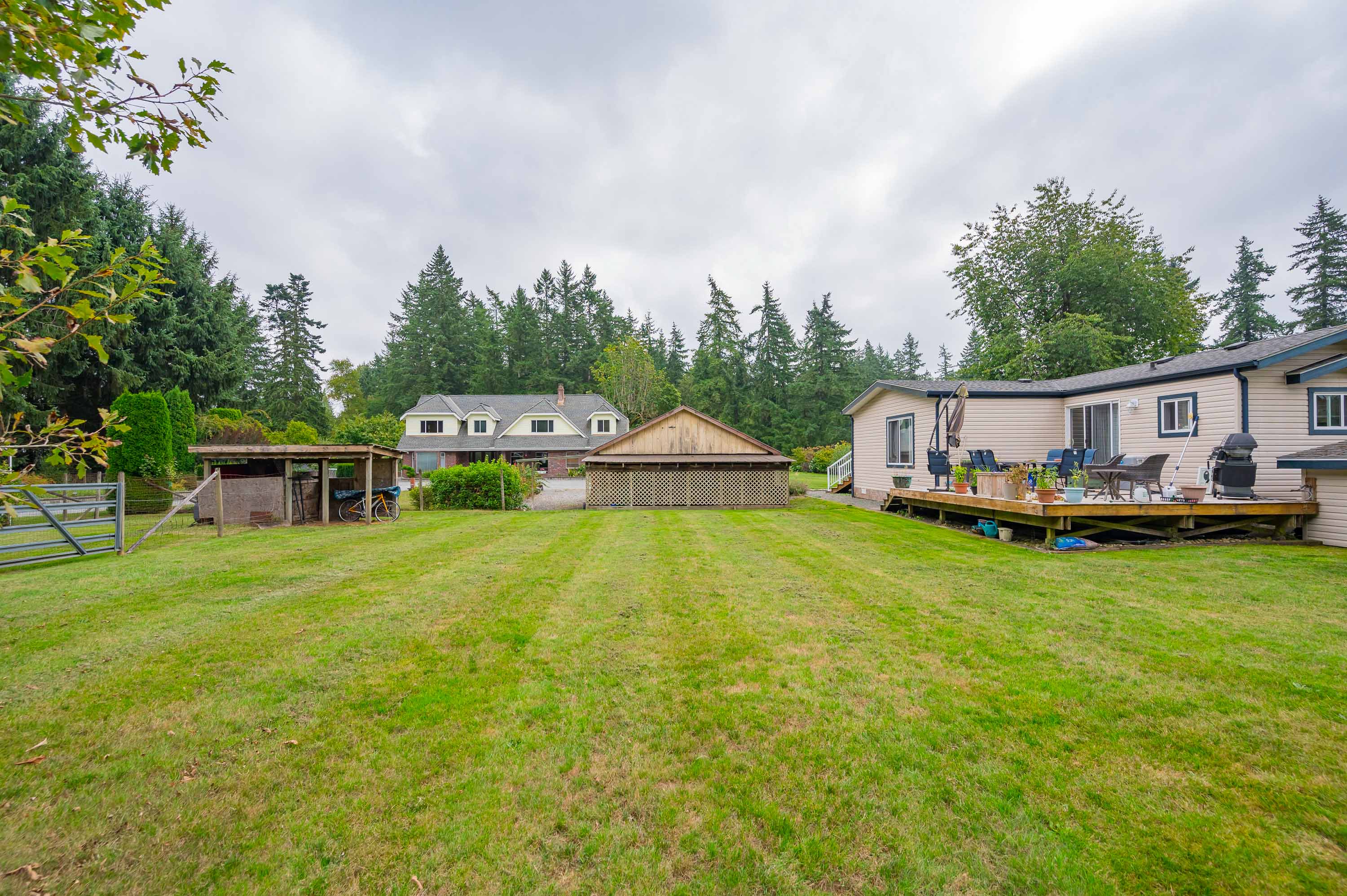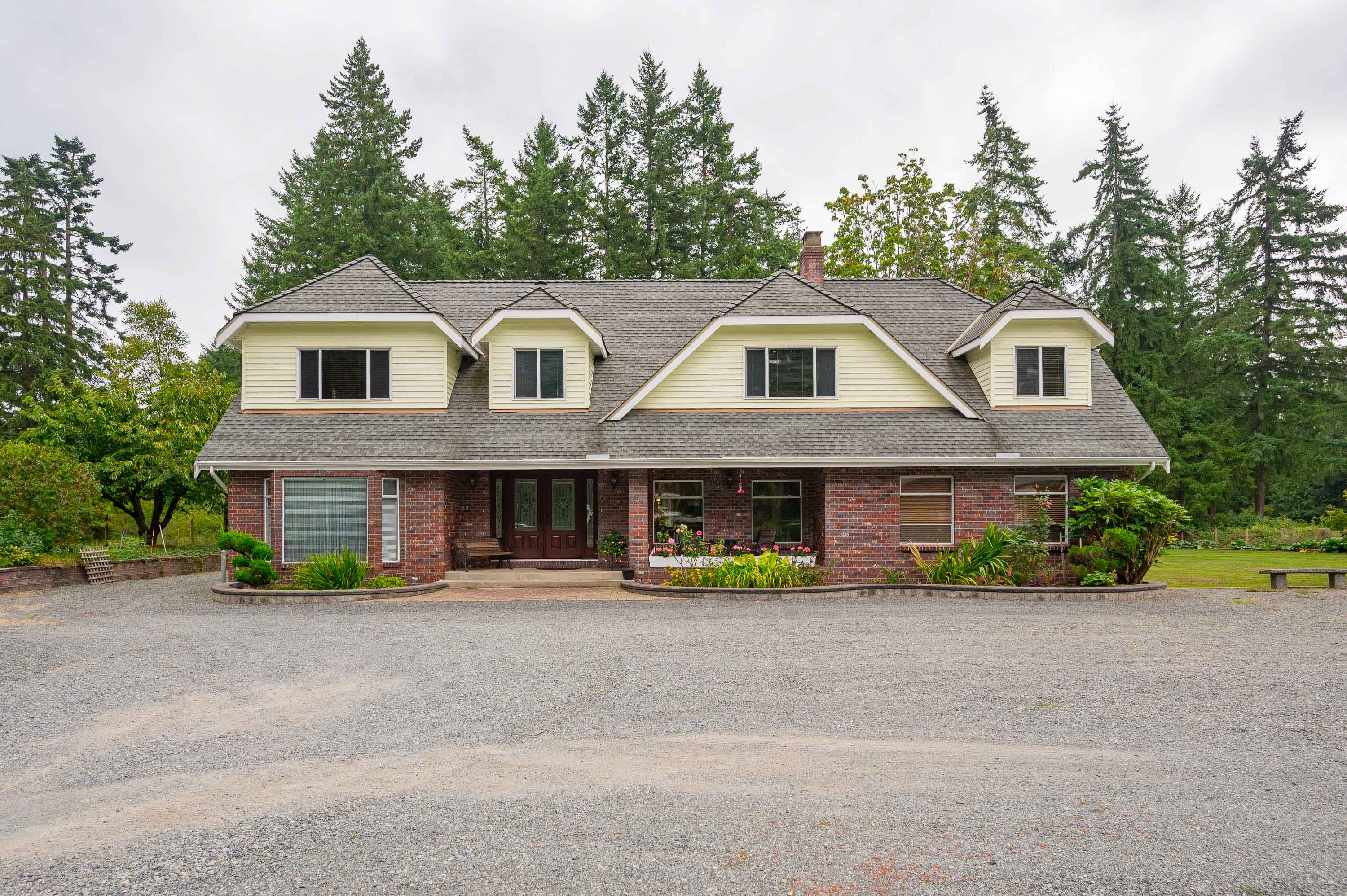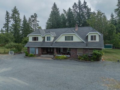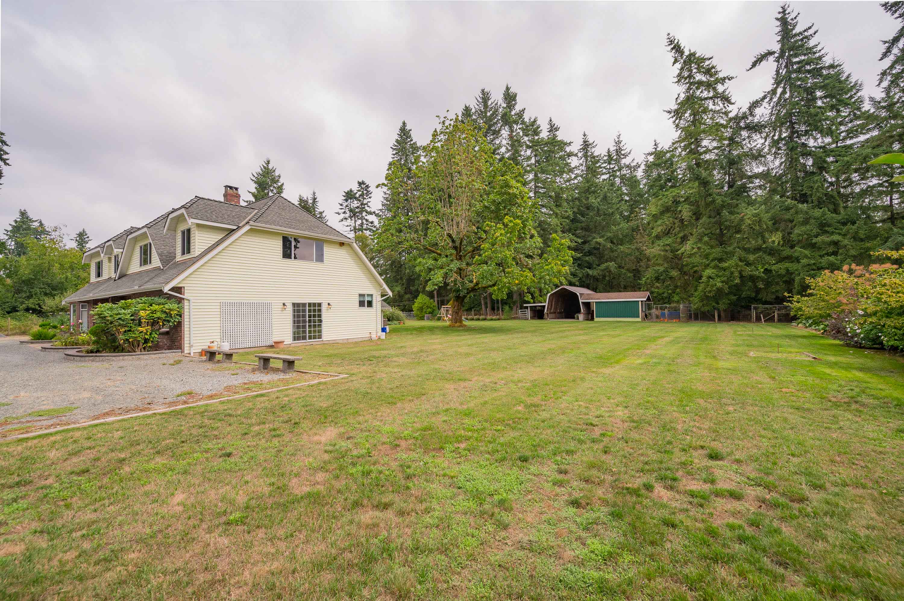 First time on the market! The original owner is selling this custom designed and built 3,950sq.ft. cape cod on a beautiful flat with no creeks, no right of ways or easements 2.5 Acres in the Brookswood development area. This home has been very well maintained and includes a fully renovated kitchen with built in double oven, and microwave, gas stove top in island, and wine fridge. Primary suite features spa size ensuite and huge walk-in closet. There is also an amazing 1,190sq.ft. 2 bedroom/ 2bathroom mobile. Included is a greenhouse, barn with lean-to and deluxe chicken coop. This gated property also offers beautiful gardens, fruit trees and a very private yard. Raise your family here and profit later.