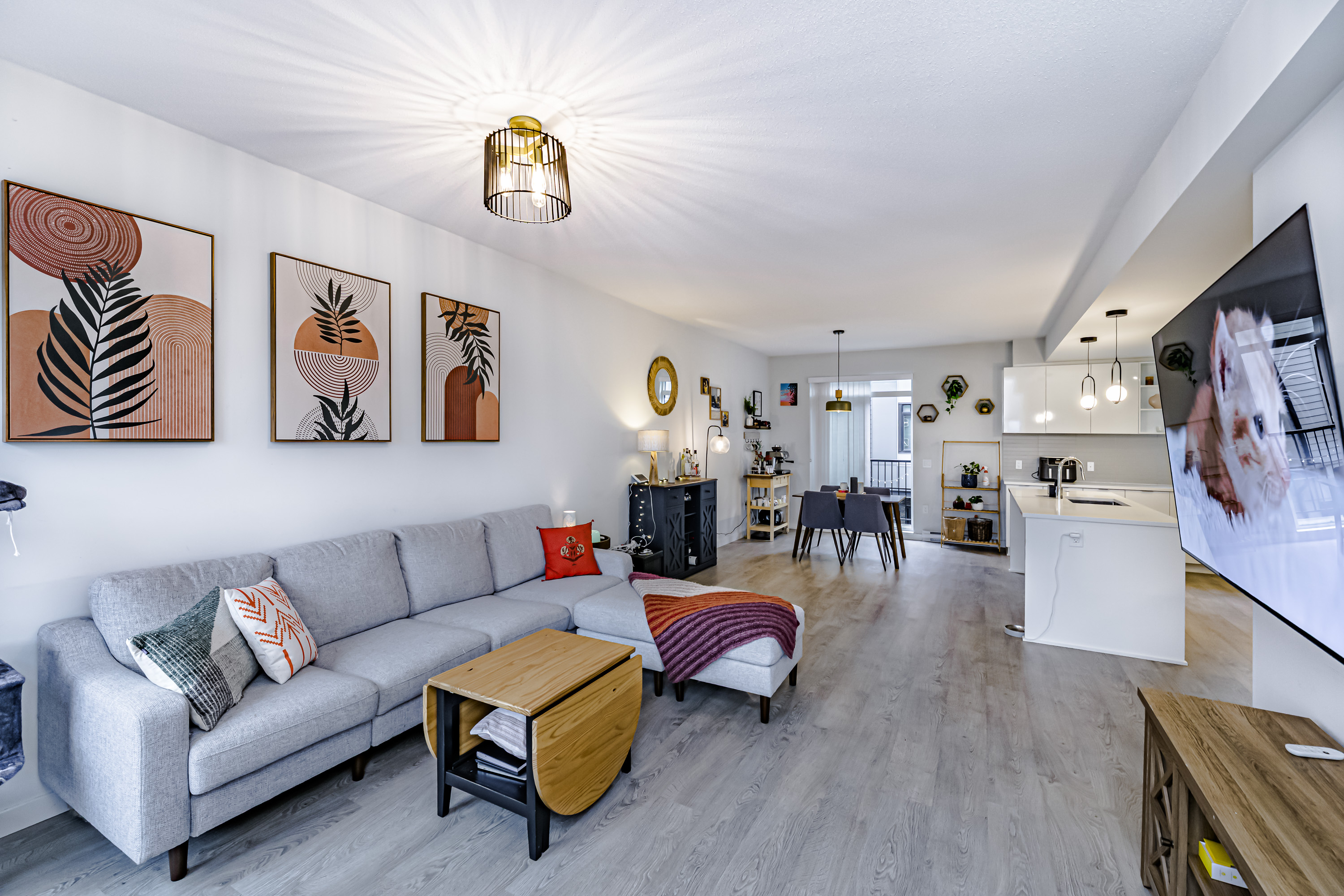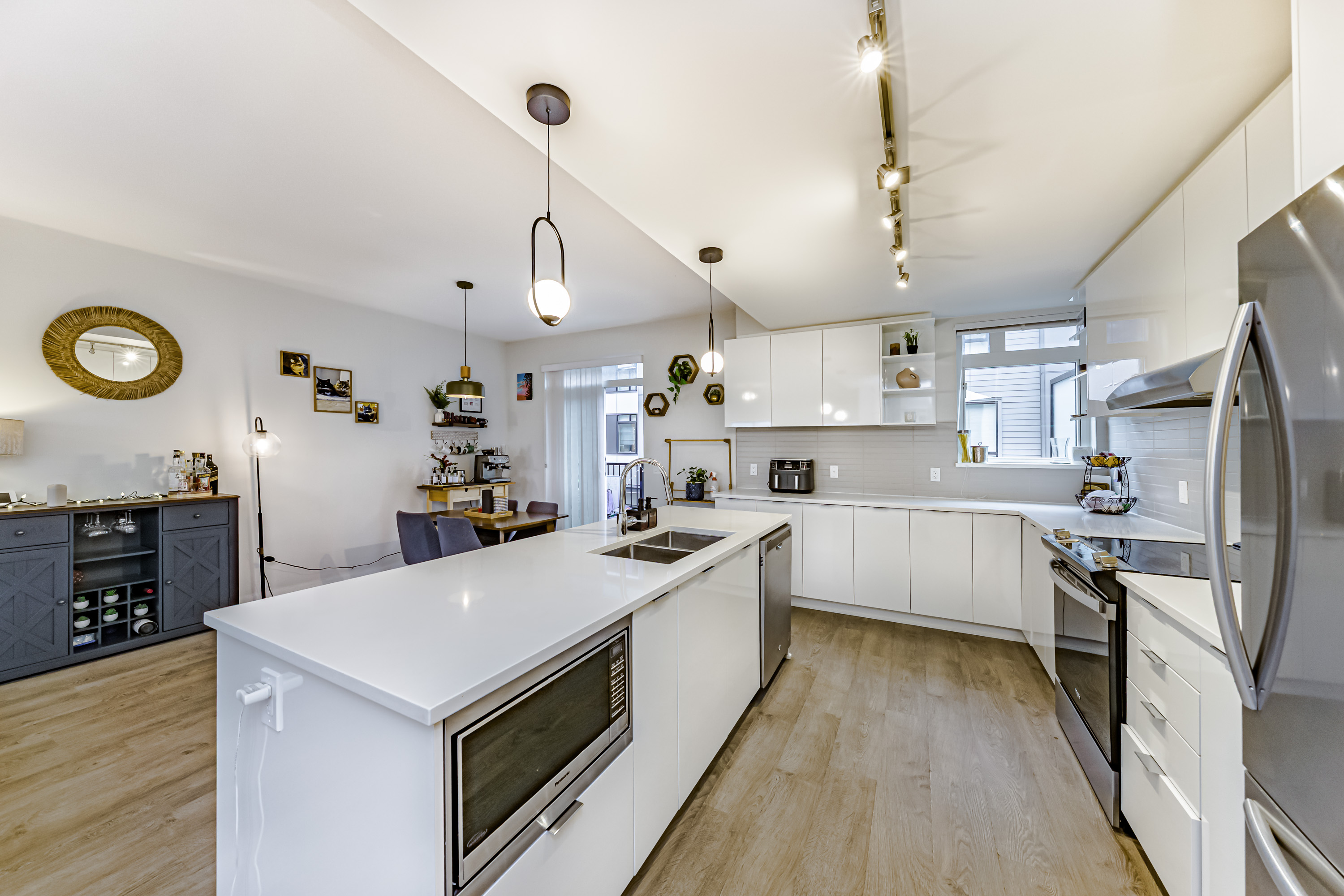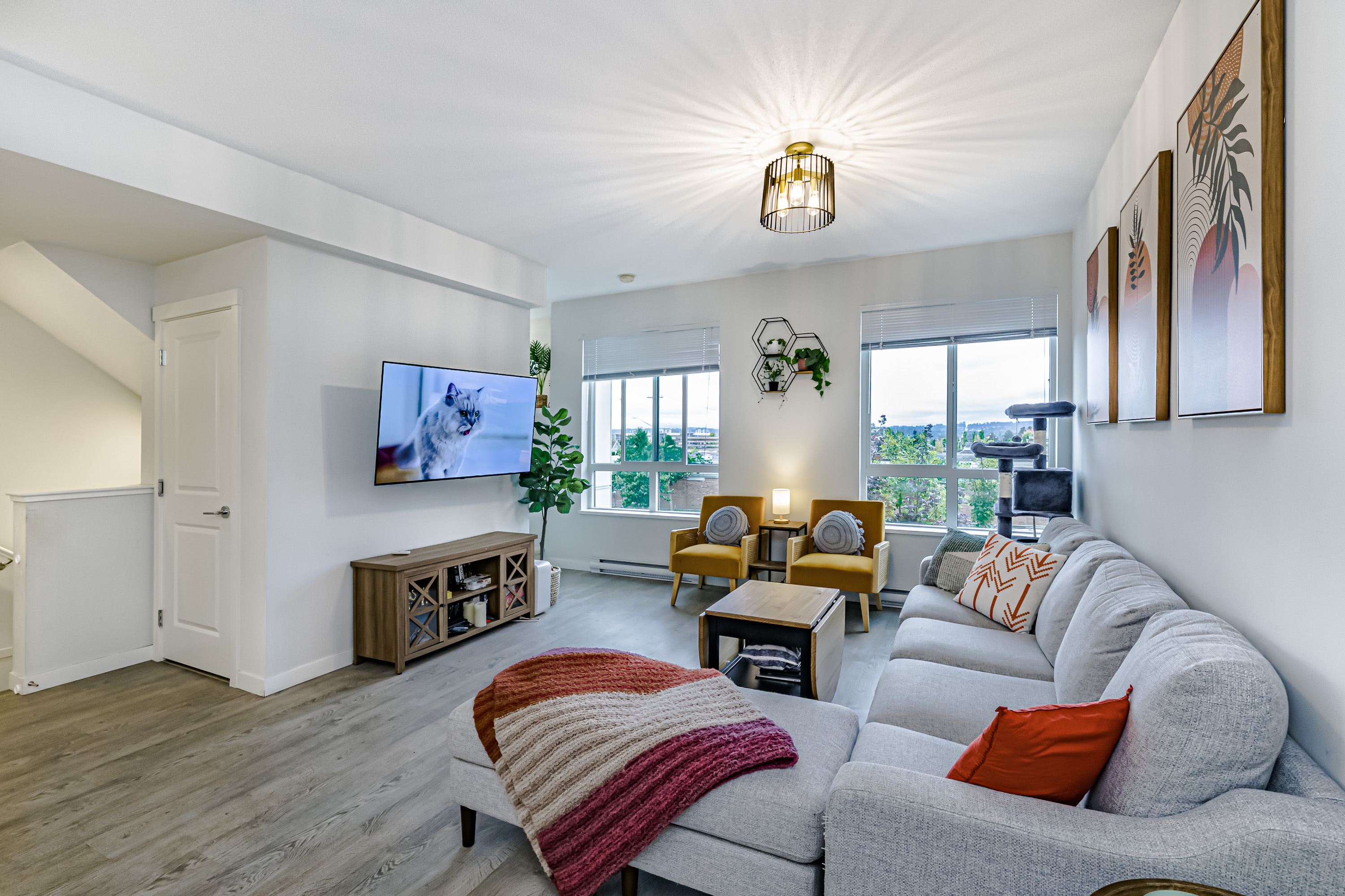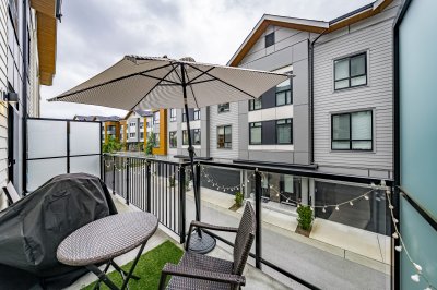 Welcome to Townsend by Polygon, a sought-after community in Panorama. This modern 3-level townhome offers 3 bedrooms, 2.5 baths, plus a flexible ground-floor room (9’ x 10’10”) with large window—ideal as a bedroom, office, guest suite, or playroom. The main floor showcases open-concept living with 9’ ceilings, oversized windows, and a gourmet kitchen featuring quartz countertops, stainless steel appliances, and a spacious island for gatherings. Upstairs you’ll find 3 bright bedrooms, including a primary with spa-inspired ensuite and dual walk-in closets. Additional highlights include a sunny south-facing deck, powder room on the main, side-by-side double garage with ample storage, and access to a resident-only 3-level clubhouse with lounge and party room.