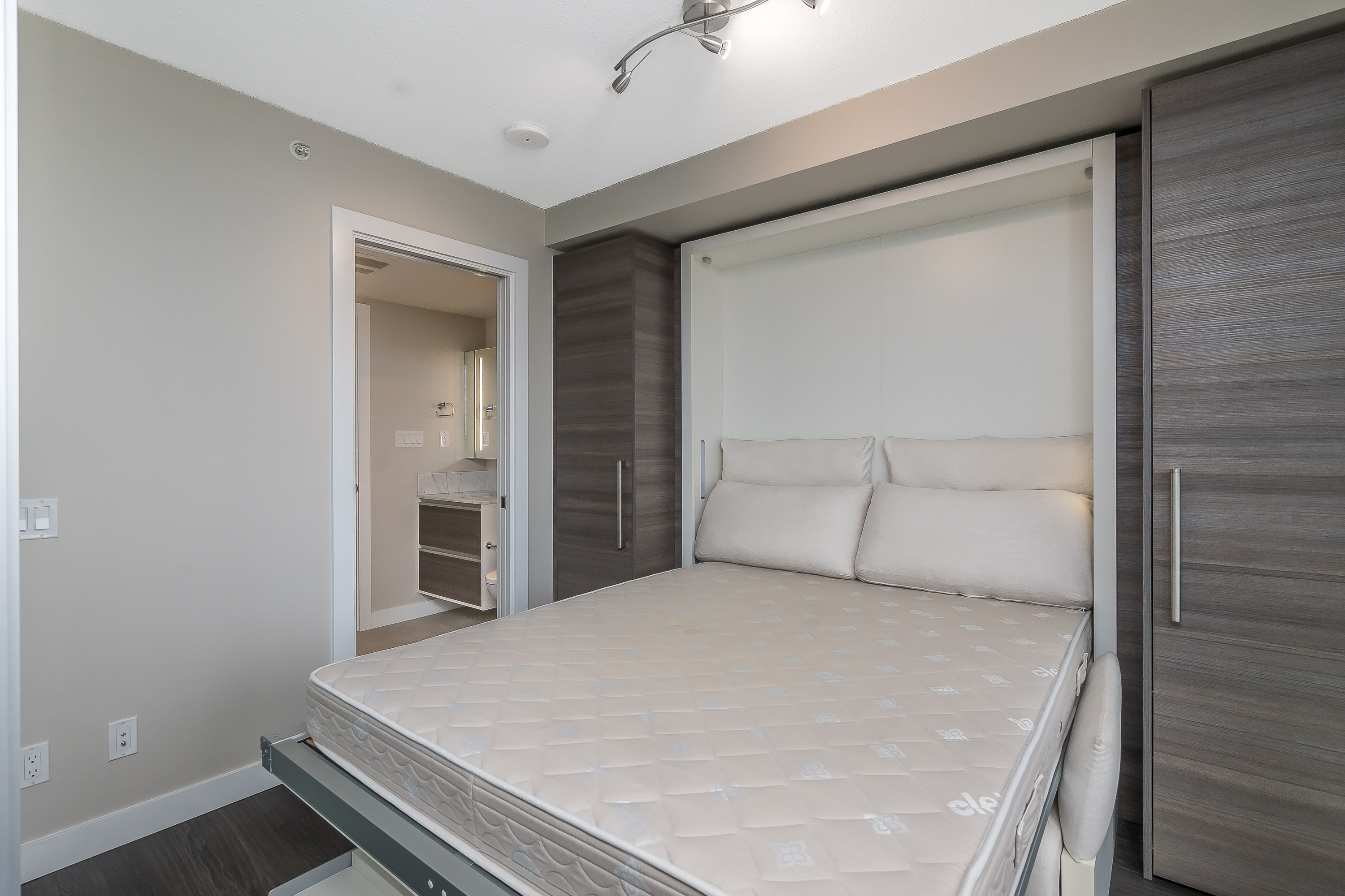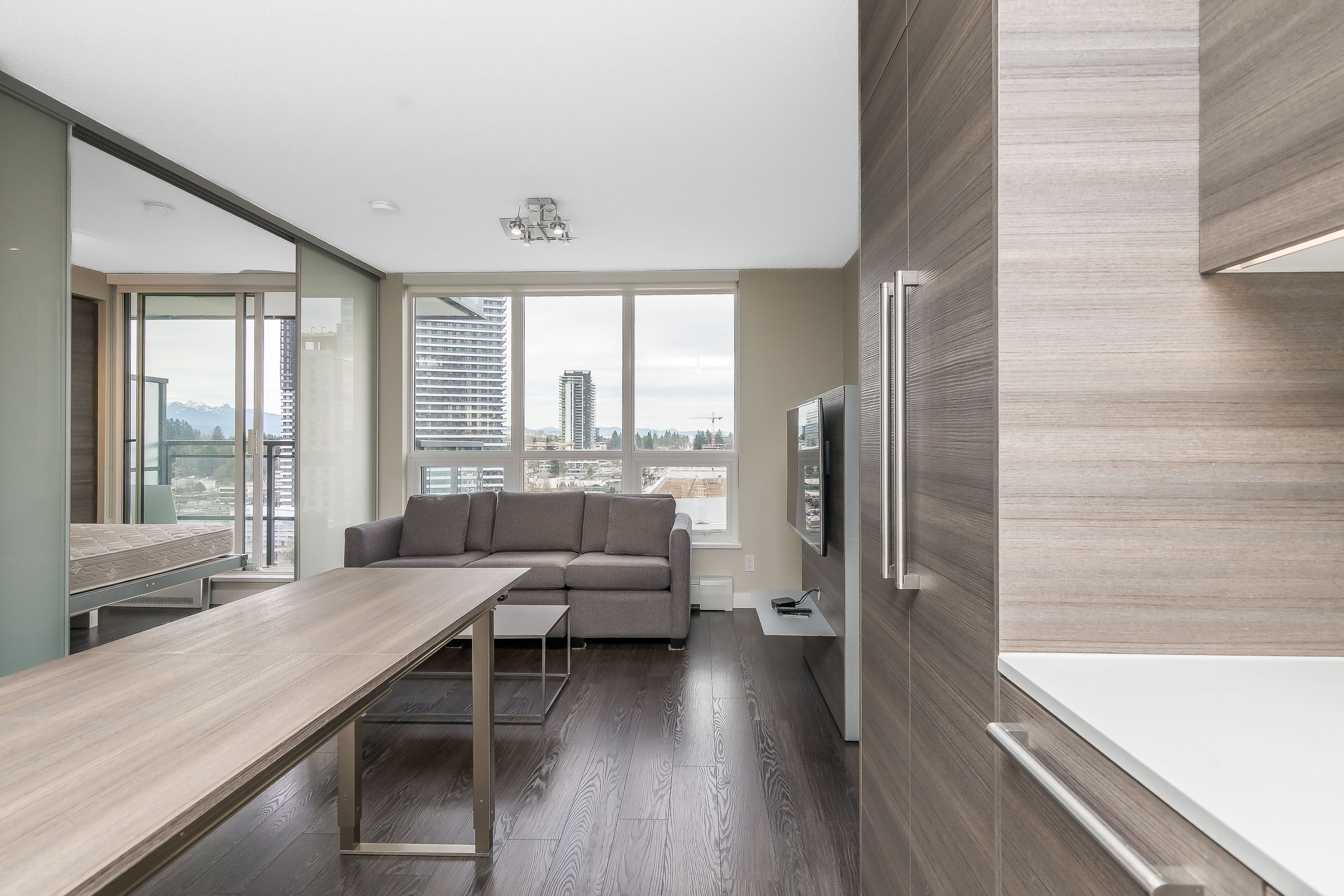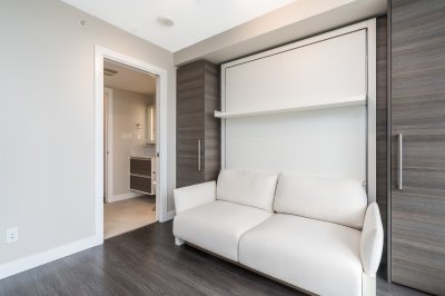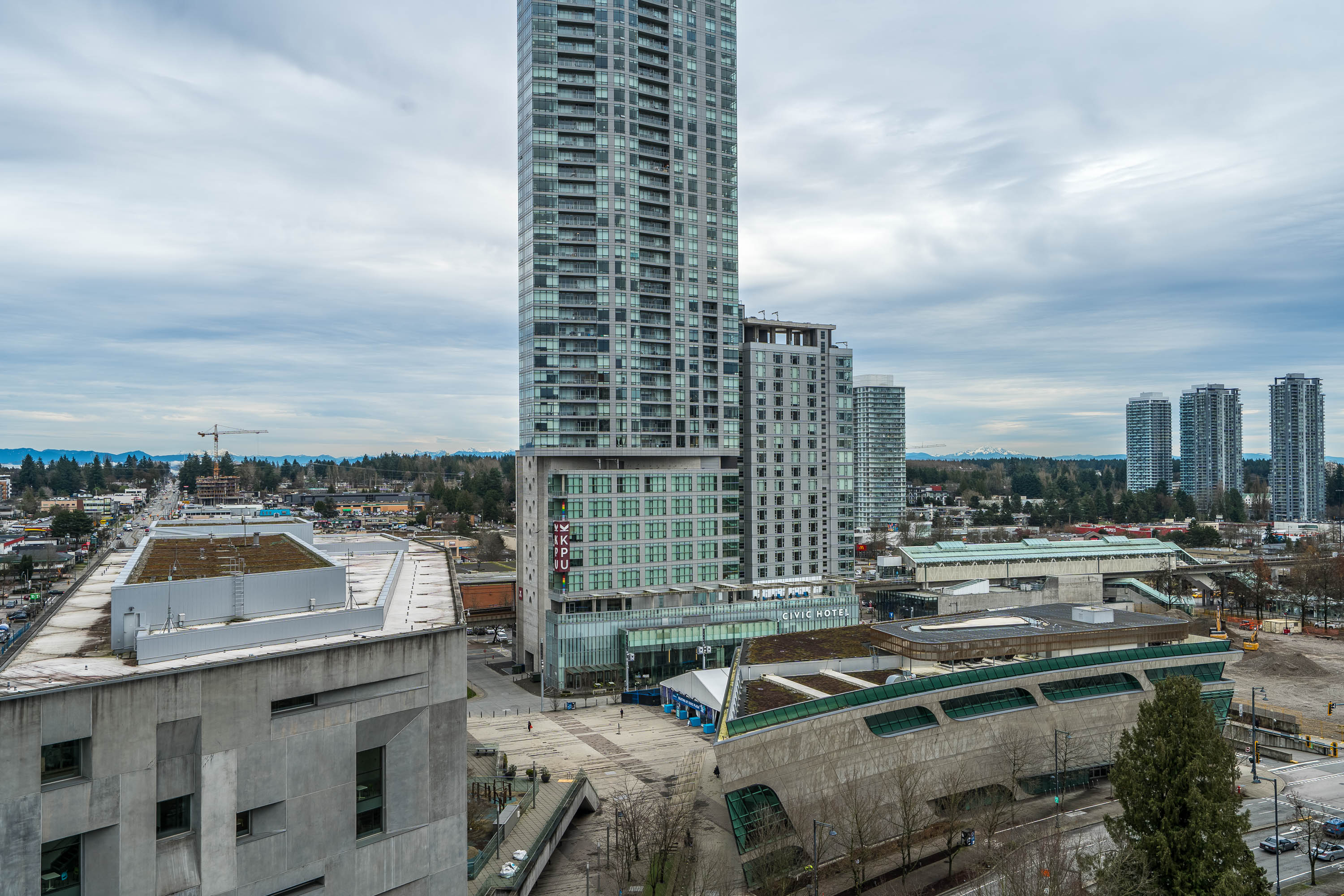 WELCOME TO ALUMNI – a sought-after concrete high-rise offering intelligent design and modern urban living. This great view 1-bedroom corner unit provides excellent privacy and a bright, open layout with floor-to-ceiling windows. Great view facing city hall and the courtyard. Featuring Bosa’s signature space-saving ergonomic design, including an integrated dining table, hidden guest bed, and pull-out sofa bed—perfect for flexible living. Every inch is thoughtfully designed for comfort and functionality. Steps to SkyTrain, SFU, KPU, T&T Supermarket, Central City Mall, and dining options. 1 parking, 1 locker. Vacant & easy to show.