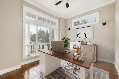 Welcome to this warm and inviting 4-bedroom, 4-bath home on a quiet corner lot in the desirable Elgin neighbourhood. With 10' ceilings the bright, open family and dining area features hardwood floors, built-ins, and cozy gas fireplace. Kitchen offers abundant cabinetry, stainless appliances, a newer range, and seamless access to a spacious deck. Front room provides the ideal home office. Upstairs are 3 generous bedrooms, laundry room, and a beautiful primary retreat with vaulted ceilings, electric fireplace, walk-in closet, and spa-inspired ensuite. Basement has unauth 1-bed+flex suite with separate entry. Minutes to Hwy 99, transit on King George, shops+restaurants. Semiahmoo Trail, Elgin Park catchments. Come see why this could be the perfect place to call home! OPEN SUN APR !9th 2-4 PM