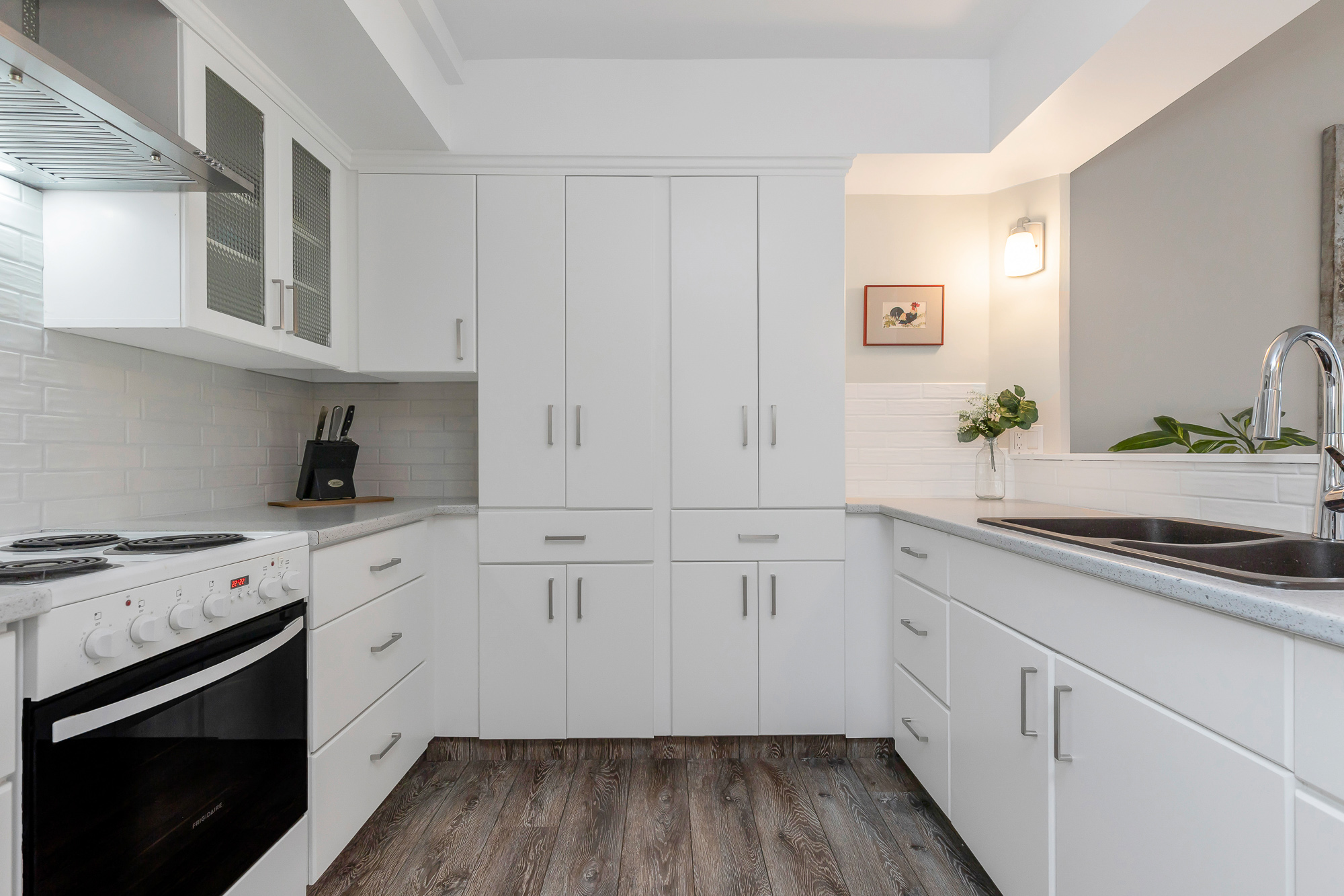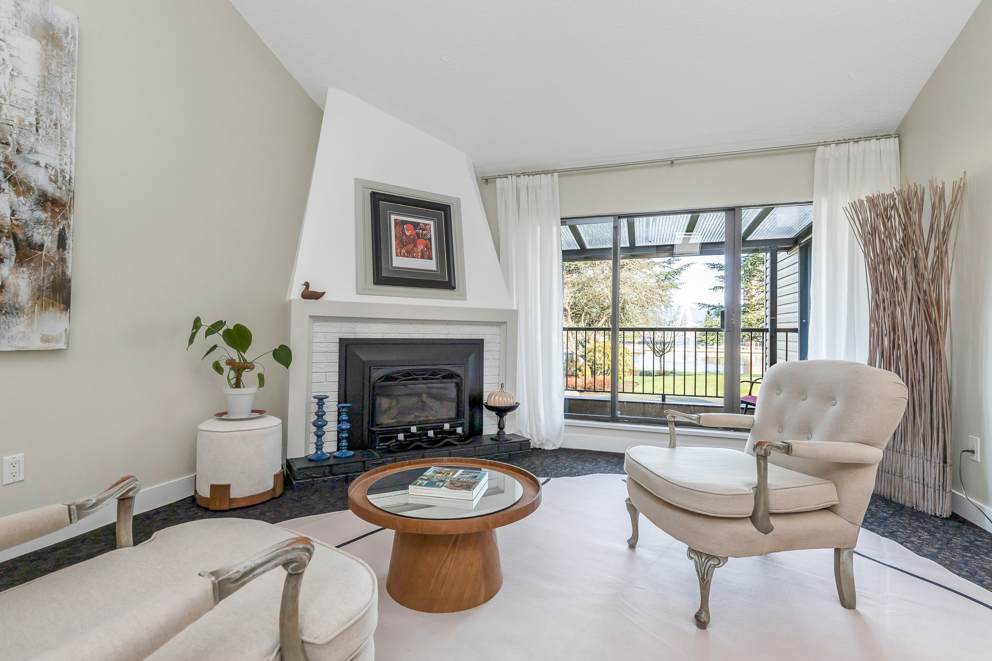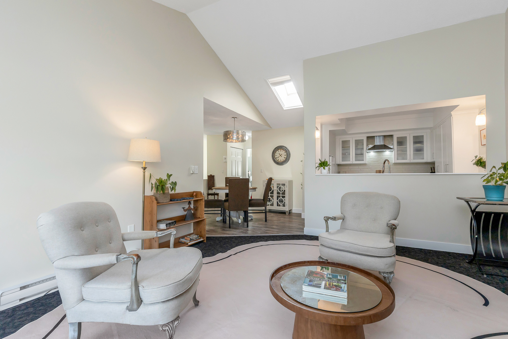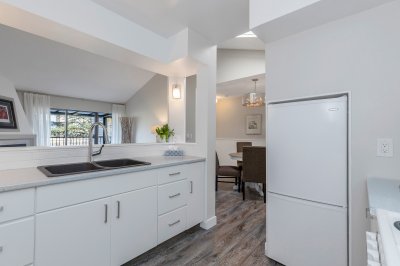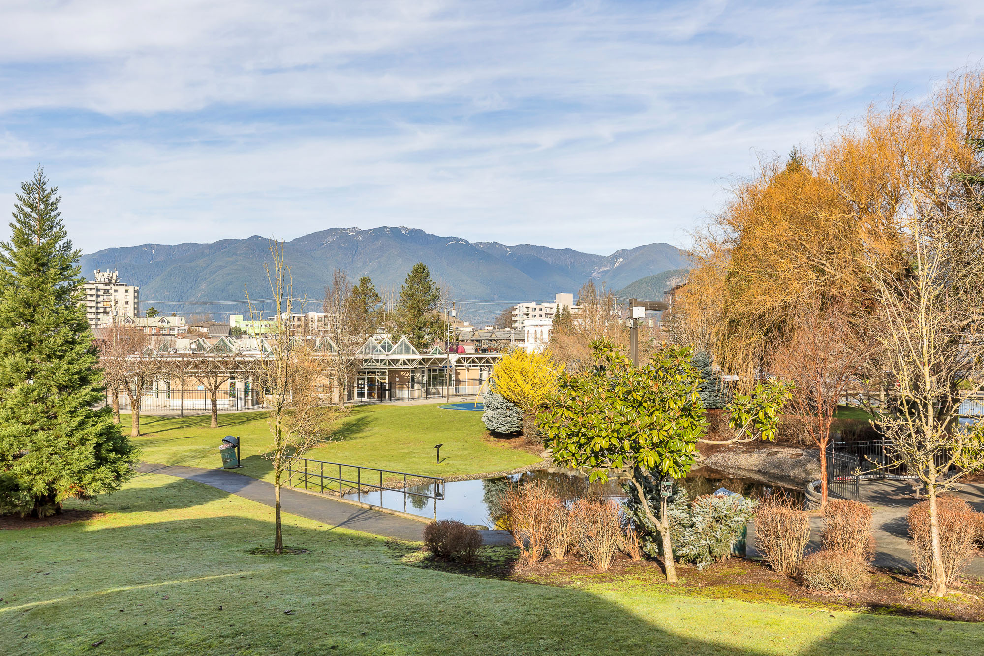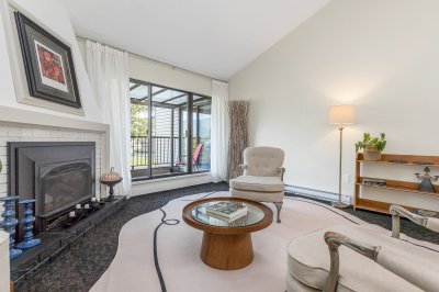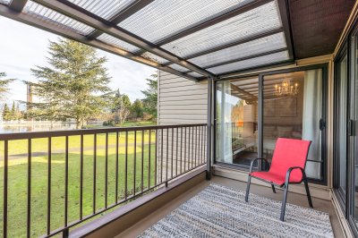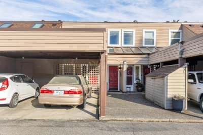 Elegant remodeled townhome where soaring ceilings, windows on three sides and skylights converge to create a super airy home. Steps from District 1881. Architectural interest continues with a chef-inspired kitchen boasting deep drawers, tray ceiling, cutouts that frame peaceful views over the curated landscape, waterfalls of Salish Park. Handsome entry with new lighting, a private park-side deck offering a serene space to relax and enjoy the water and mountain views. Thoughtfully positioned bedrooms provide privacy, updated bath and fresh BM paint, new windows, efficient gas fireplace, 2025 water tank, full laundry room, and generous storage locker located off the semi-private carport. Situated on a very quiet street & just a short stroll to grocery stores, specialty shops, library & park