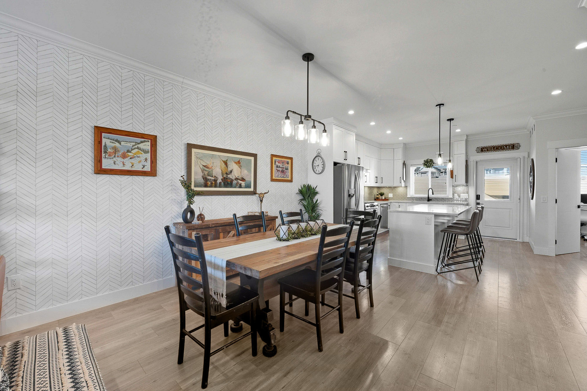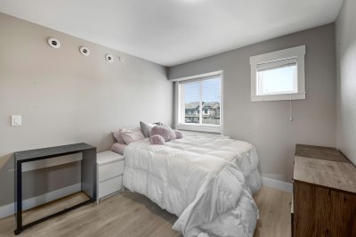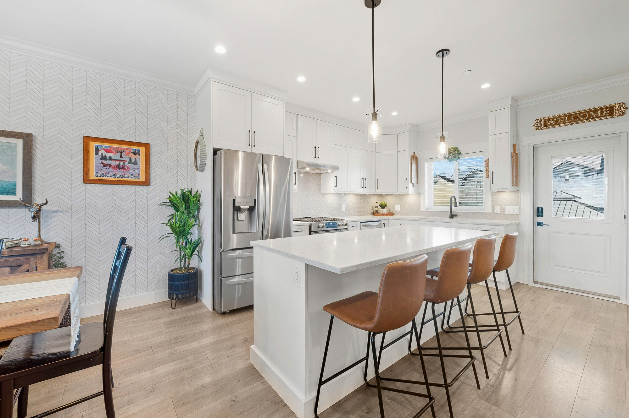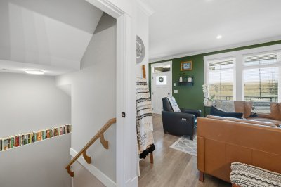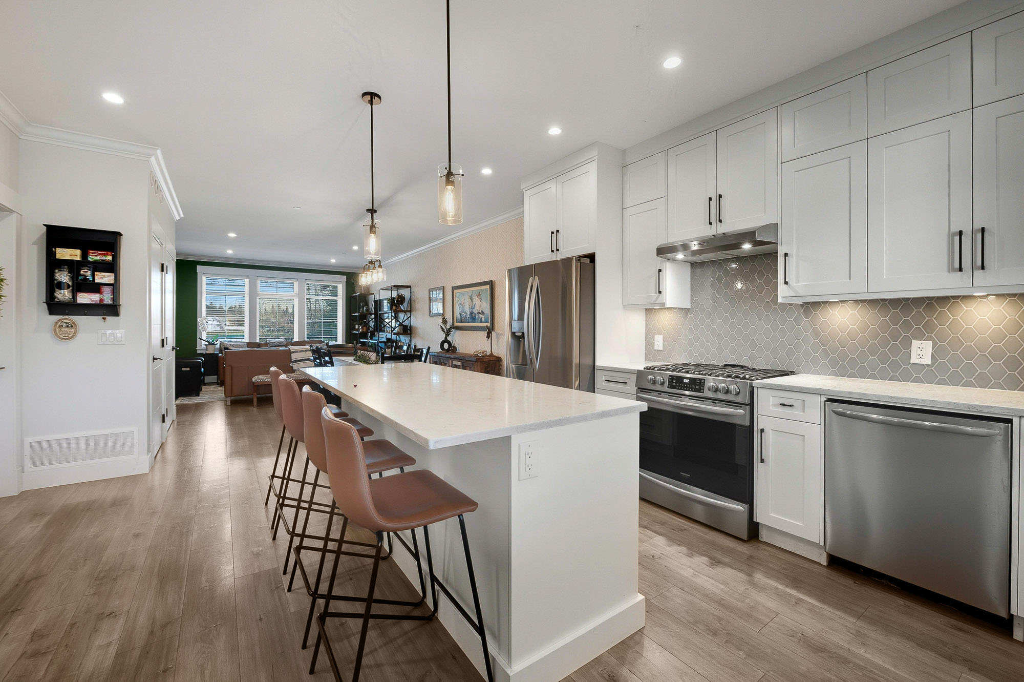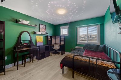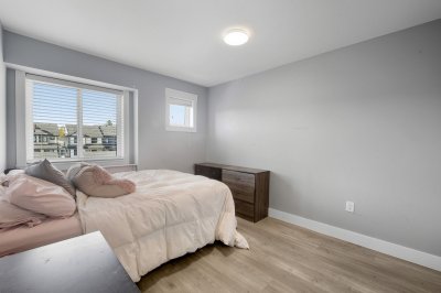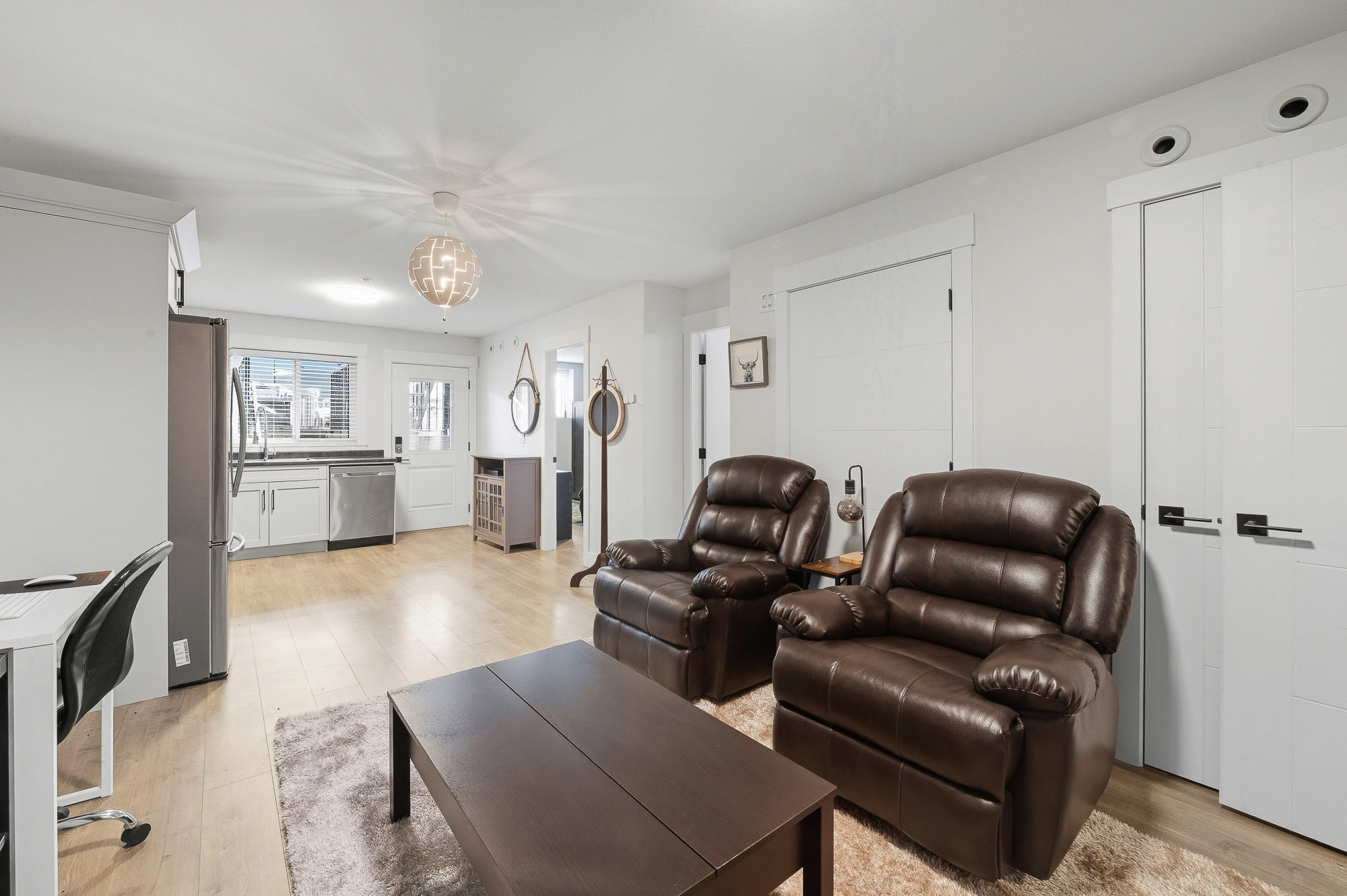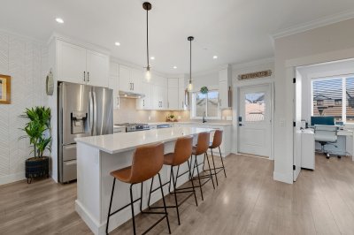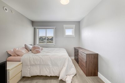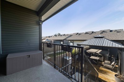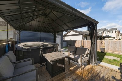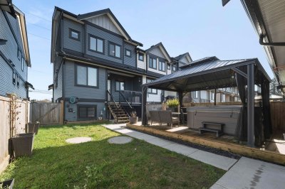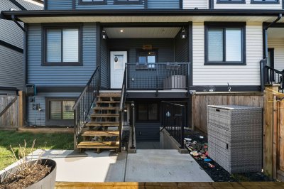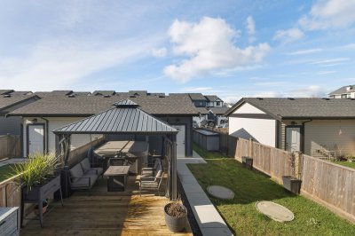 ROW HOME/NO STRATA 2,809 sq ft corner home featuring an open concept floor plan w/5 bed & 4 baths. Just 3 years old w/remaining home warranty coverage. Bright main living area w/ large entertaining island w/built-in bar fridge, oversized walk-in pantry, quartz countertops and stainless steel appliances, opening into generous living and dining spaces filled w/natural light. Bedroom on main ideal for guests, office or multi-generational living. Upstairs features 3 large bedrooms, including spacious primary w/spa-inspired ensuite w/glass walk-in shower, dual vanities and built-in makeup vanity. Basement w/media room and 1 bedroom suite, easily converted to 2 bedrooms. Large covered patio, backyard deck w/gas hookup, fenced yard and detached 2 car garage complete this exceptional home.