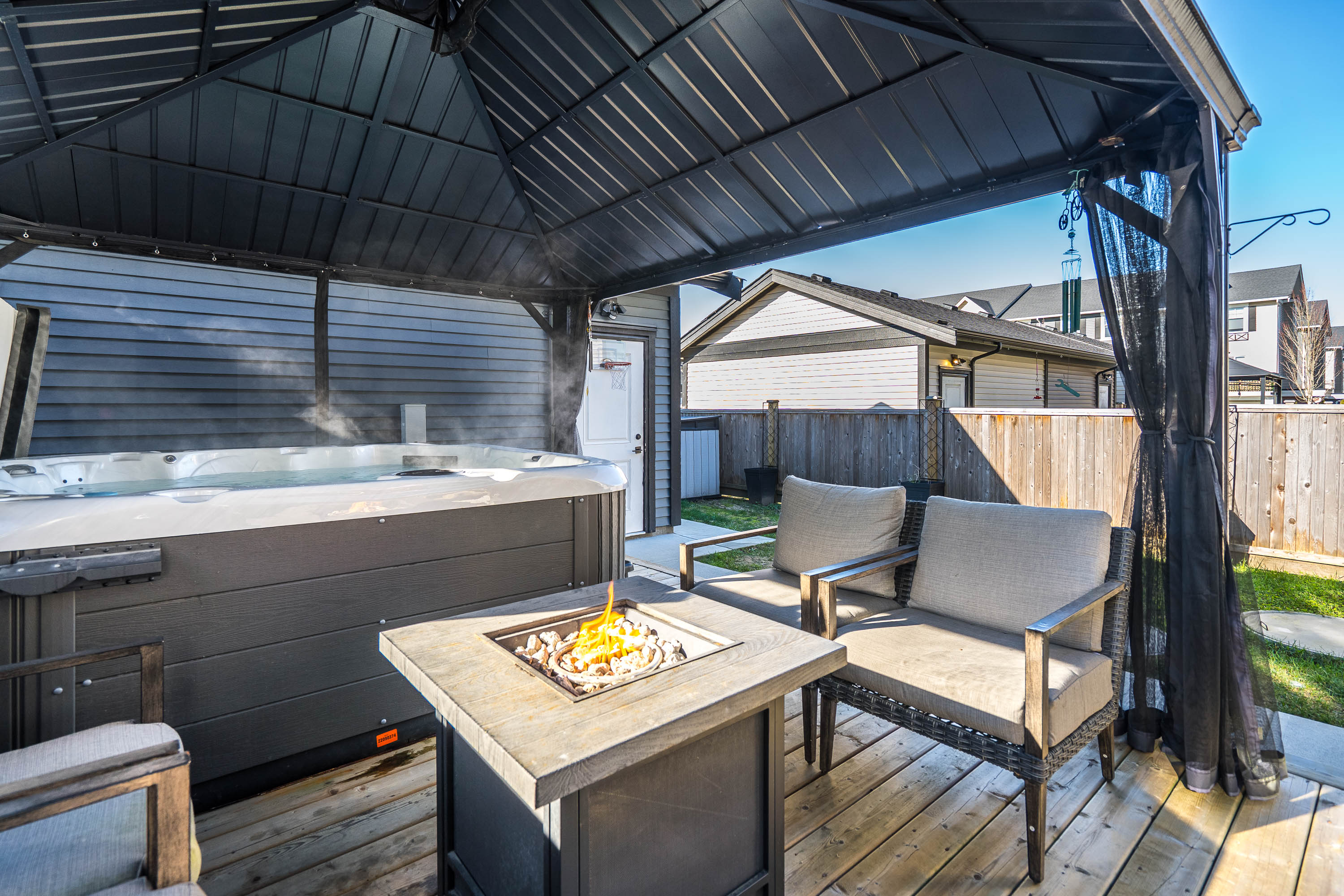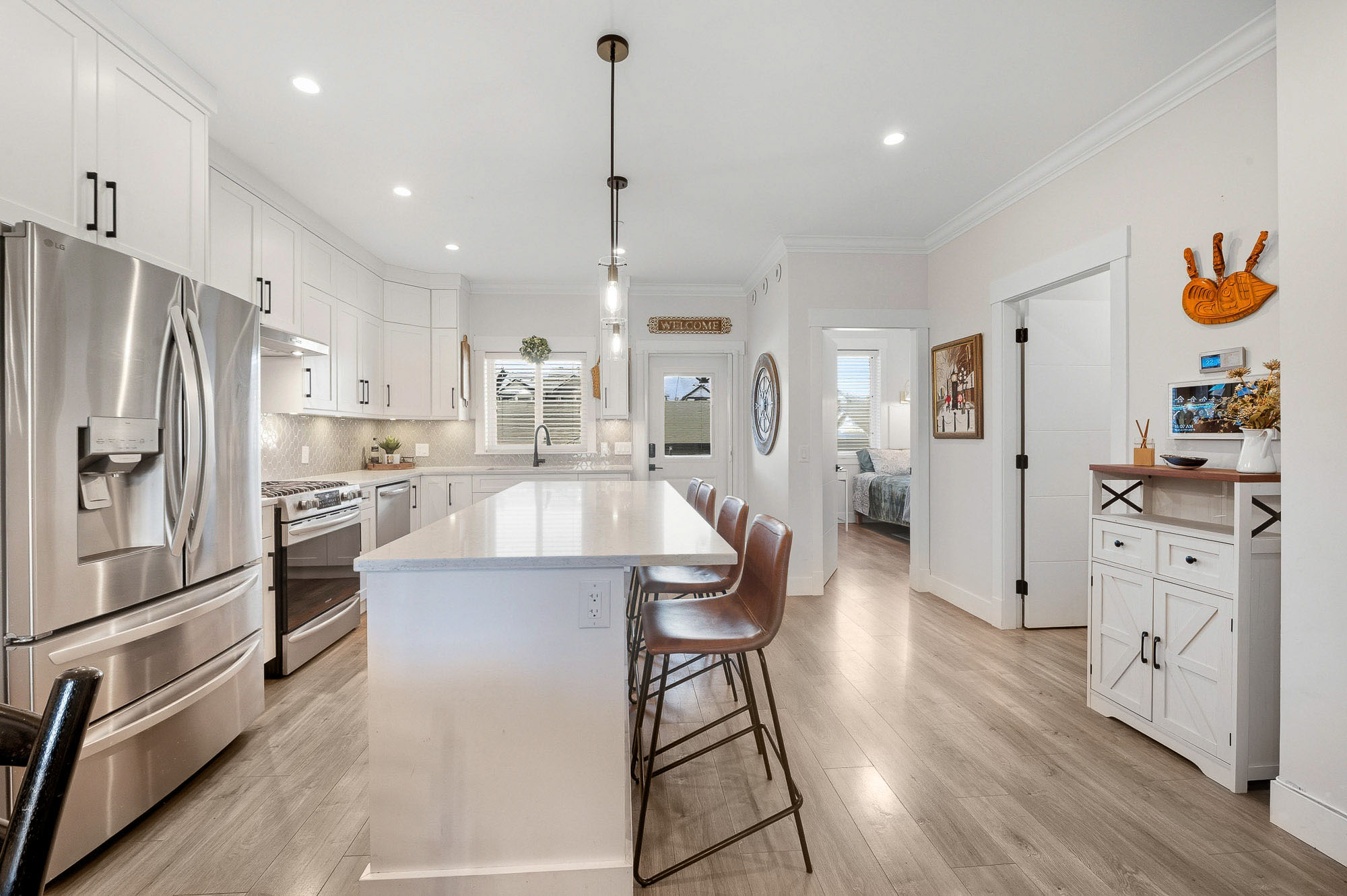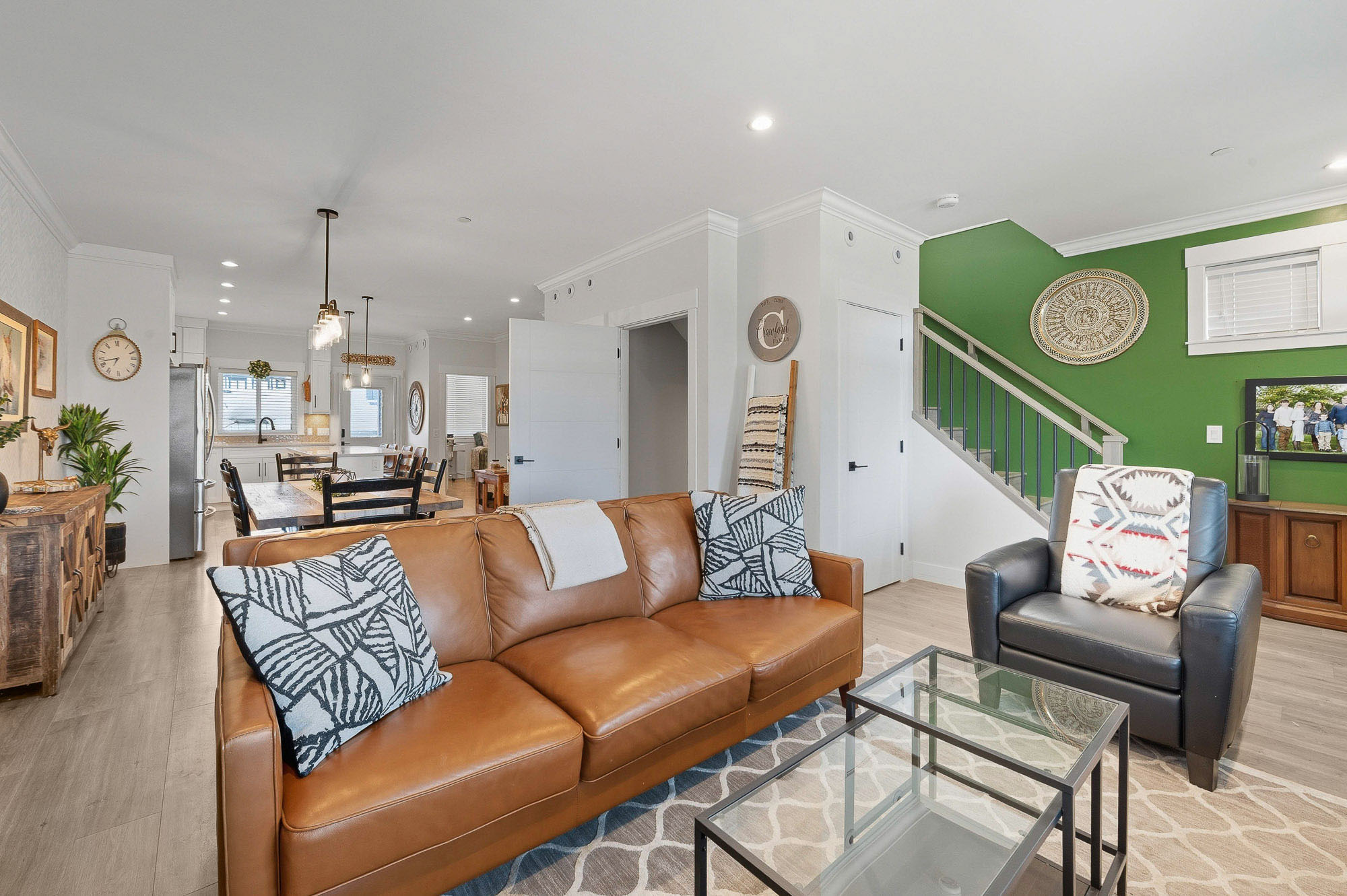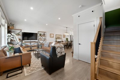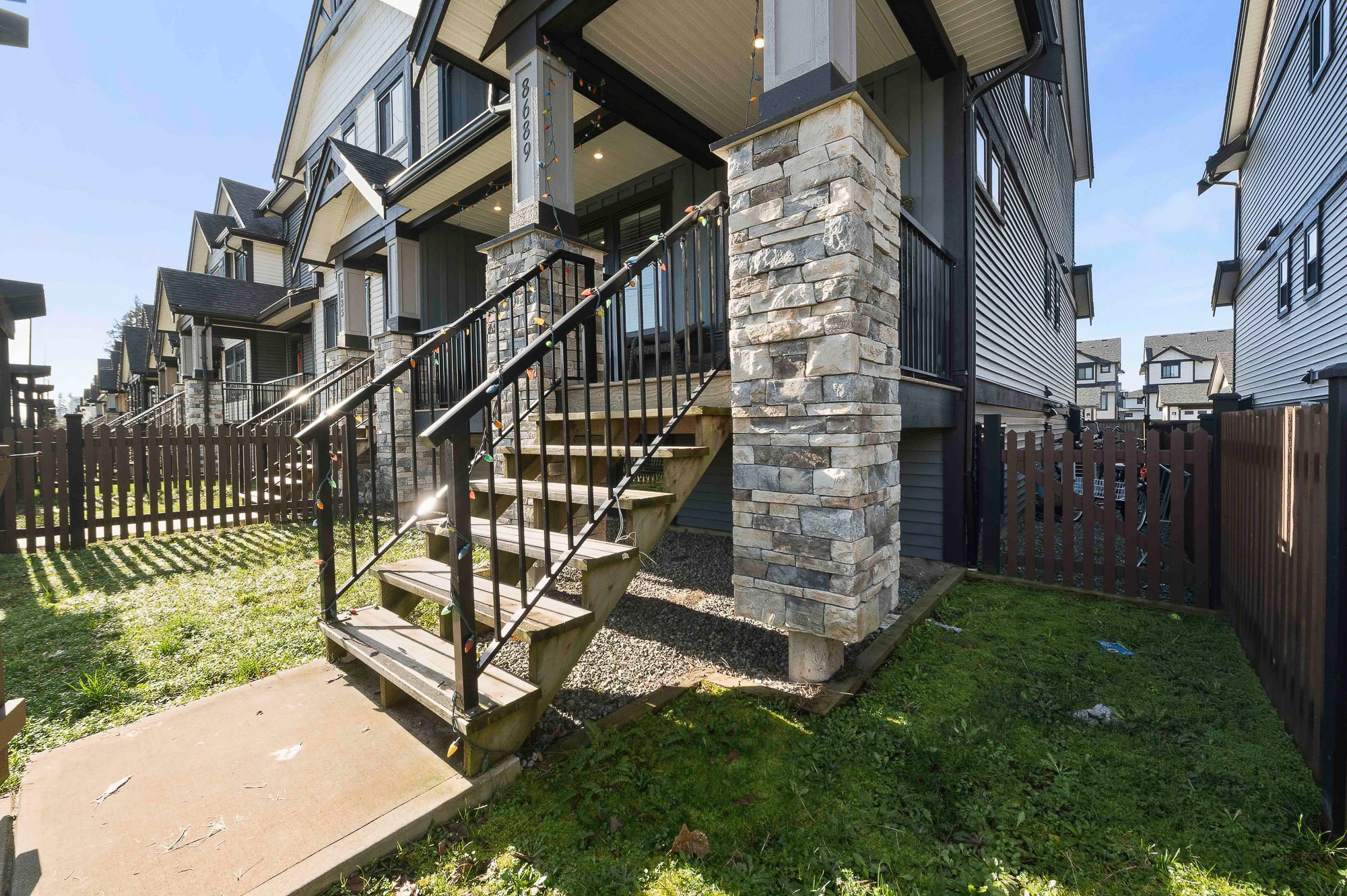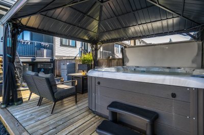 ROW HOME/NO STRATA 2,809 sq ft corner home featuring an open concept floor plan w/5 bed & 4 baths. Just 3 years old w/remaining home warranty coverage. Bright main living area w/ large entertaining island w/built-in bar fridge, oversized walk-in pantry, quartz countertops and stainless steel appliances, opening into generous living and dining spaces filled w/natural light. Bedroom on main ideal for guests, office or multi-generational living. Upstairs features 3 large bedrooms, including spacious primary w/spa-inspired ensuite w/glass walk-in shower, dual vanities and built-in makeup vanity. Basement w/media room and 1 bedroom suite, easily converted to 2 bedrooms. Large covered patio, backyard deck w/gas hookup, fenced yard and detached 2 car garage complete this exceptional home.