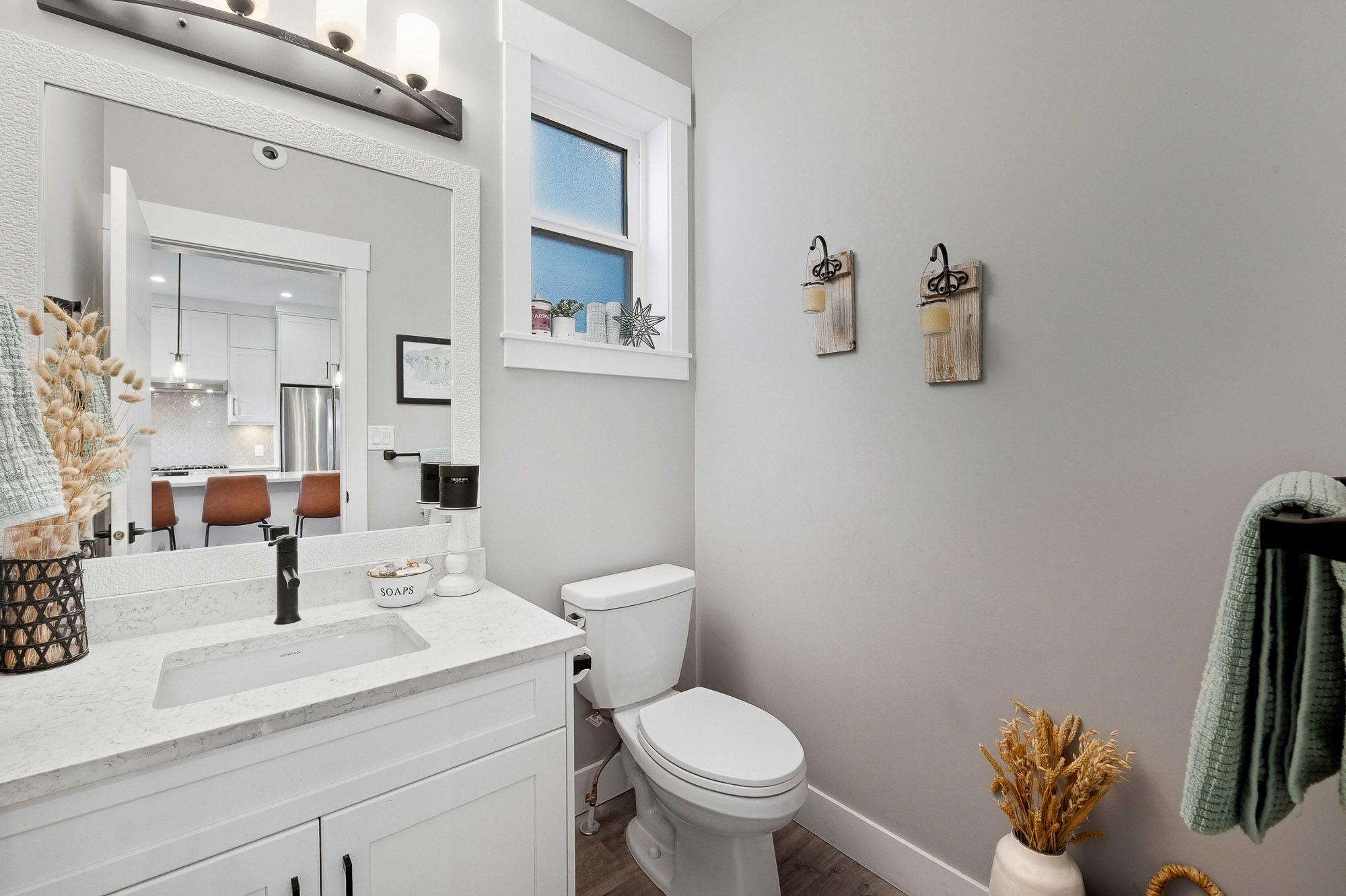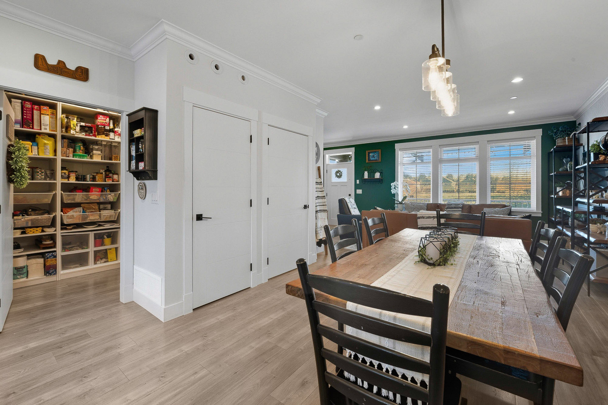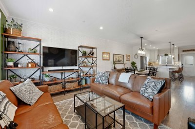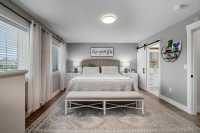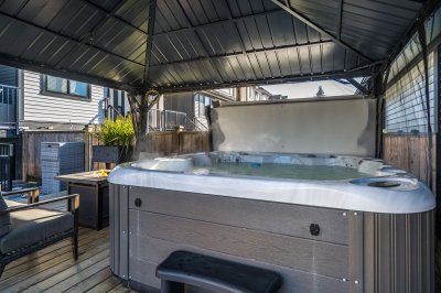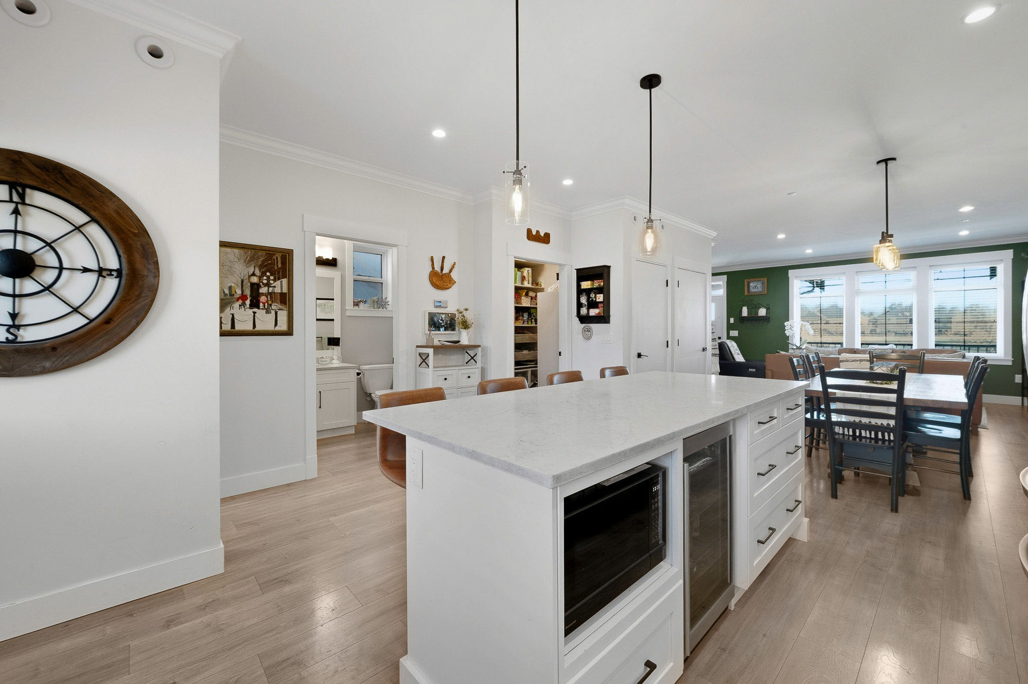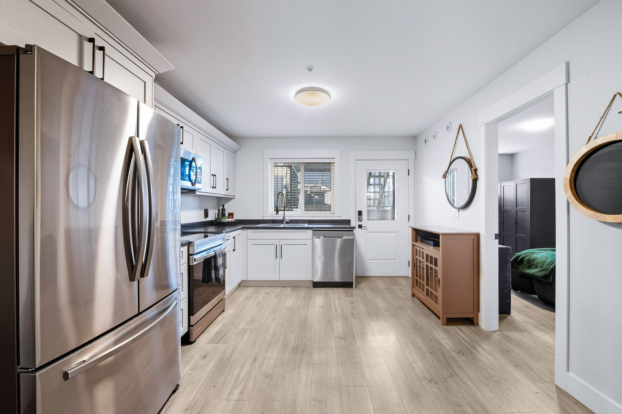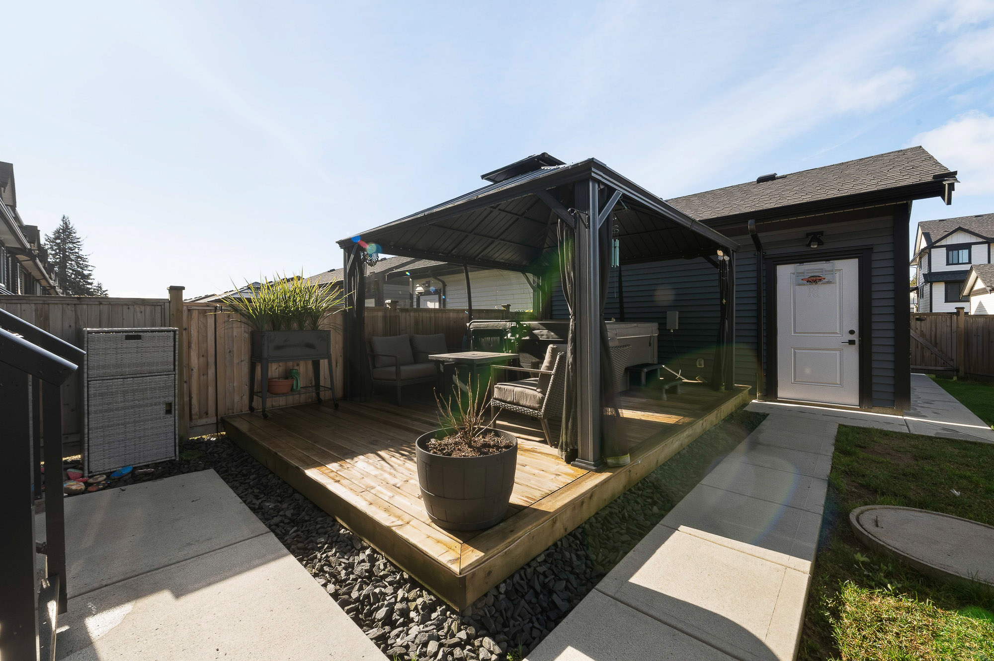 ROW HOME/NO STRATA 2,809 sq ft corner home featuring an open concept floor plan w/5 bed & 4 baths. Just 3 years old w/remaining home warranty coverage. Bright main living area w/ large entertaining island w/built-in bar fridge, oversized walk-in pantry, quartz countertops and stainless steel appliances, opening into generous living and dining spaces filled w/natural light. Bedroom on main ideal for guests, office or multi-generational living. Upstairs features 3 large bedrooms, including spacious primary w/spa-inspired ensuite w/glass walk-in shower, dual vanities and built-in makeup vanity. Basement w/media room and 1 bedroom suite, easily converted to 2 bedrooms. Large covered patio, backyard deck w/gas hookup, fenced yard and detached 2 car garage complete this exceptional home.