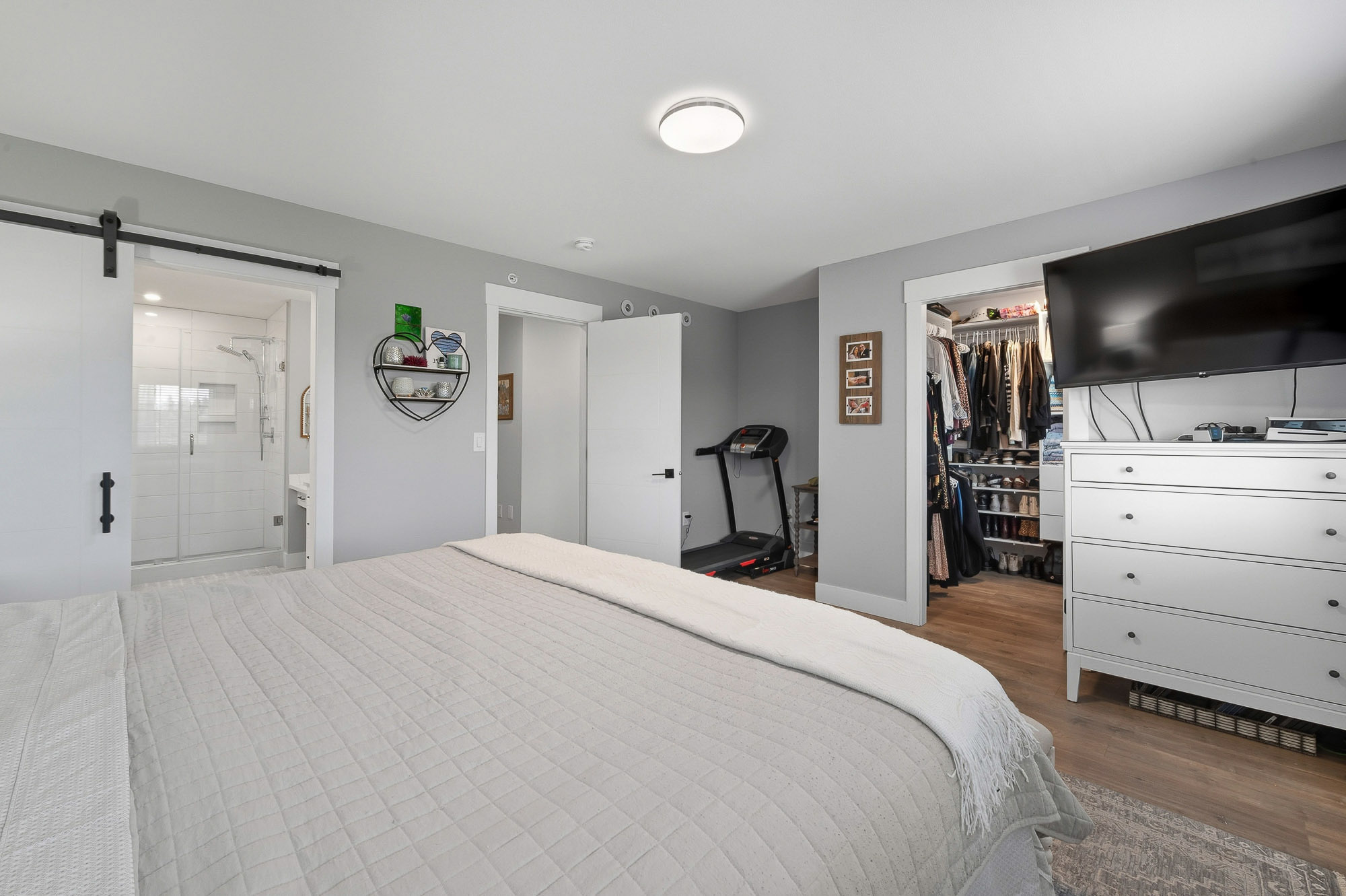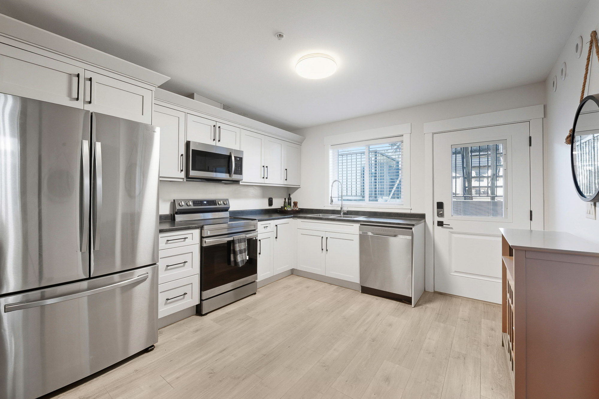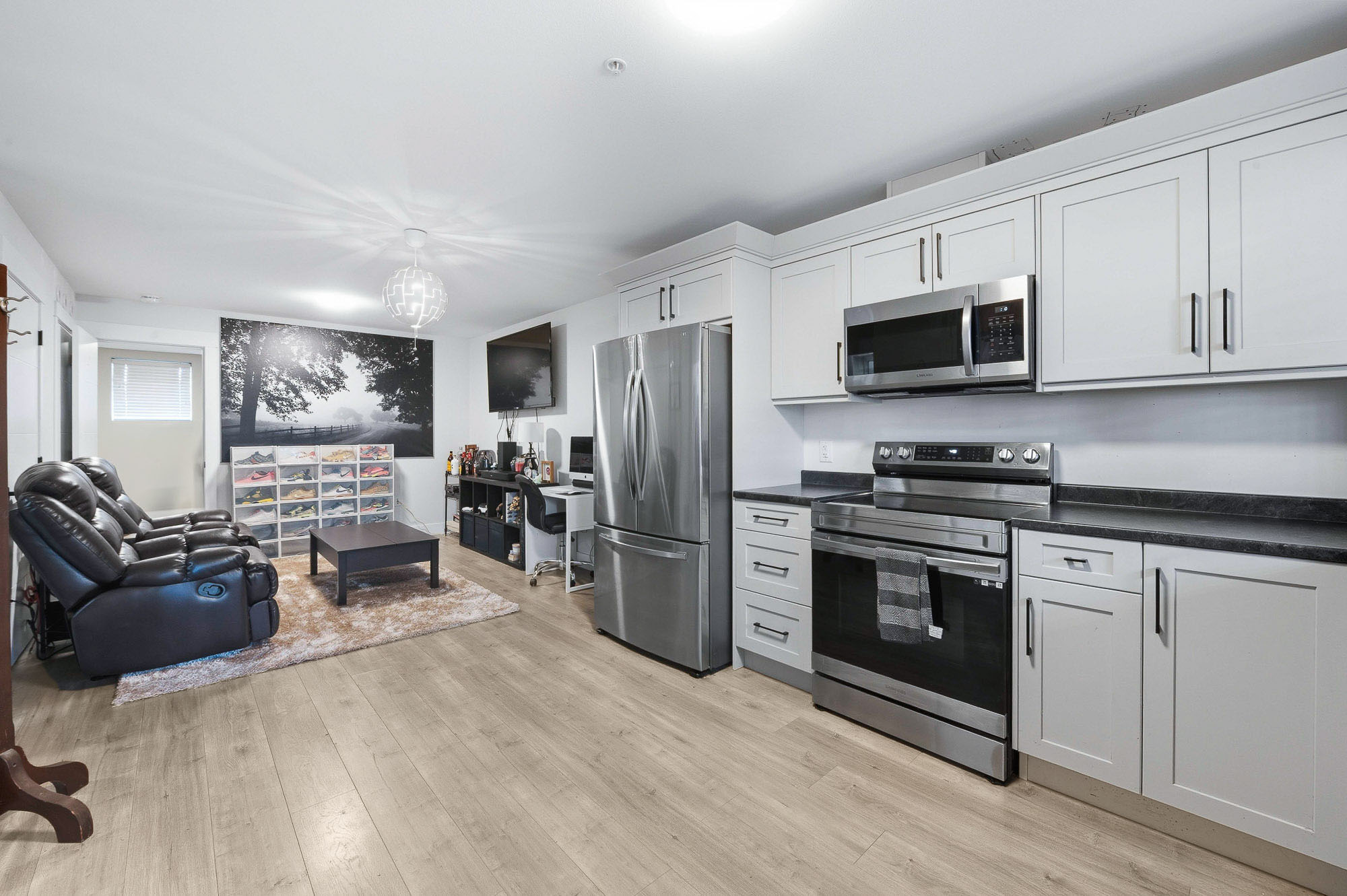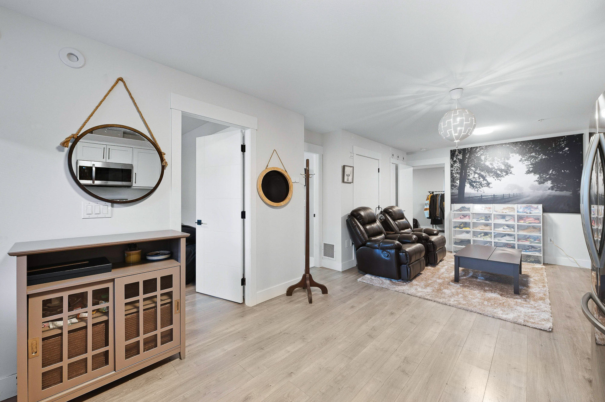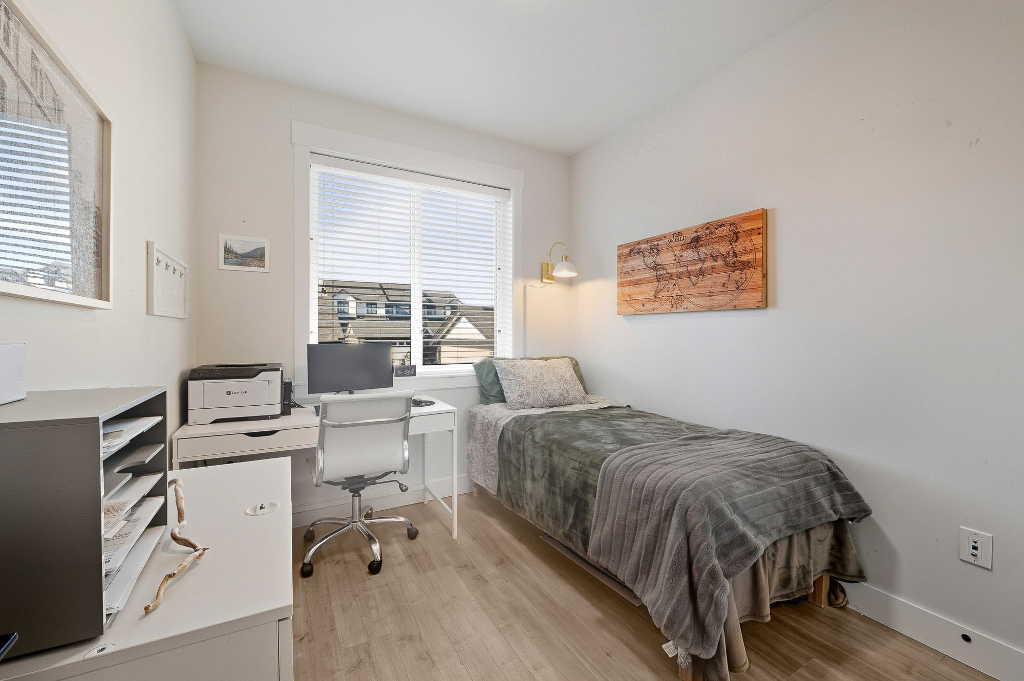 ROW HOME/NO STRATA 2,809 sq ft corner home featuring an open concept floor plan w/5 bed & 4 baths. Just 3 years old w/remaining home warranty coverage. Bright main living area w/ large entertaining island w/built-in bar fridge, oversized walk-in pantry, quartz countertops and stainless steel appliances, opening into generous living and dining spaces filled w/natural light. Bedroom on main ideal for guests, office or multi-generational living. Upstairs features 3 large bedrooms, including spacious primary w/spa-inspired ensuite w/glass walk-in shower, dual vanities and built-in makeup vanity. Basement w/media room and 1 bedroom suite, easily converted to 2 bedrooms. Large covered patio, backyard deck w/gas hookup, fenced yard and detached 2 car garage complete this exceptional home.