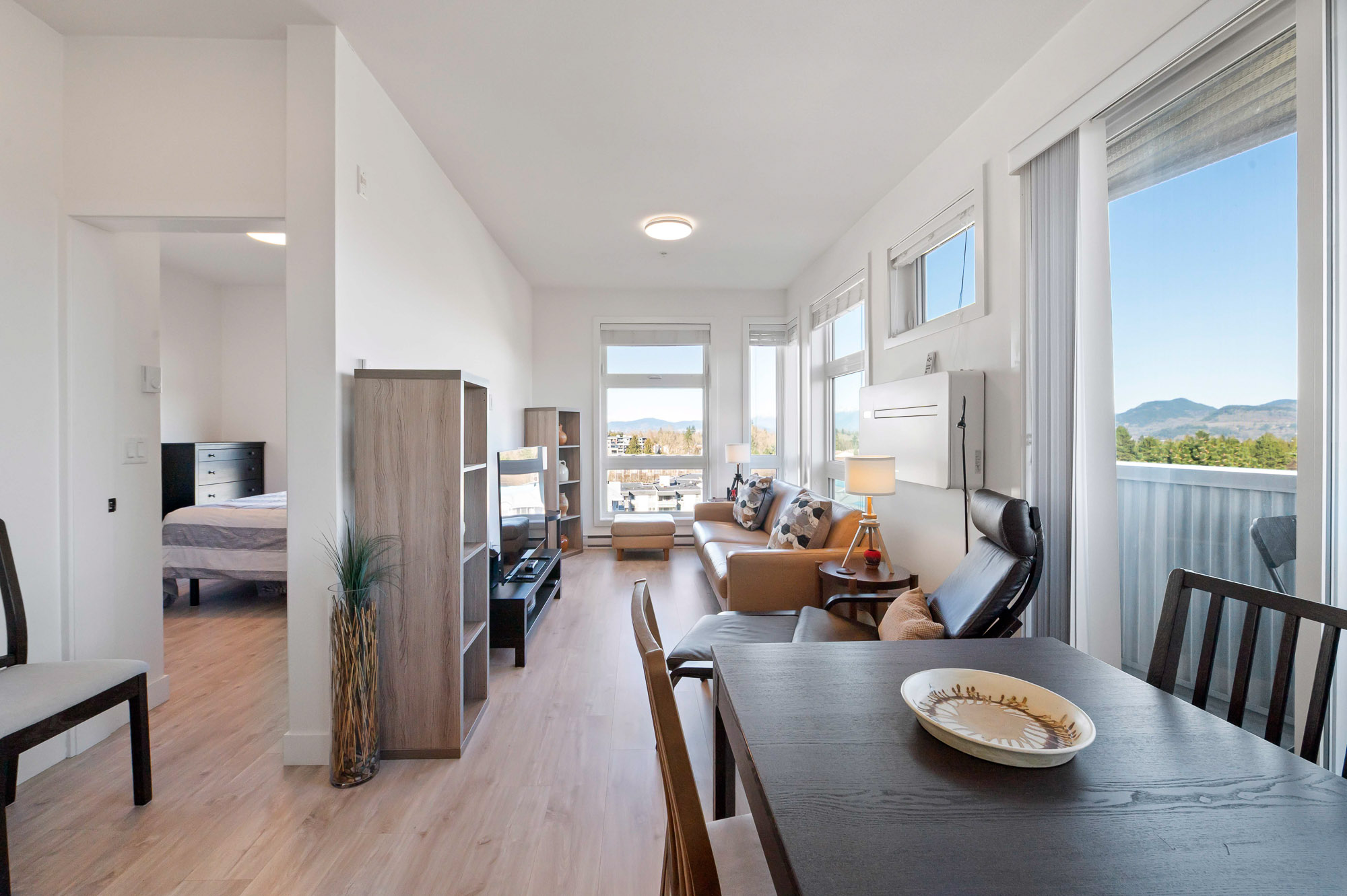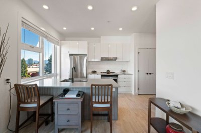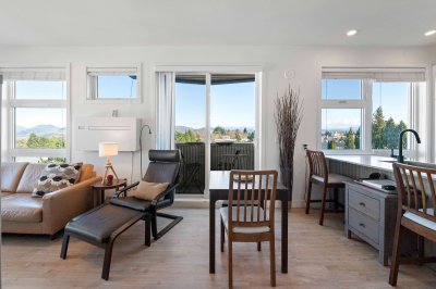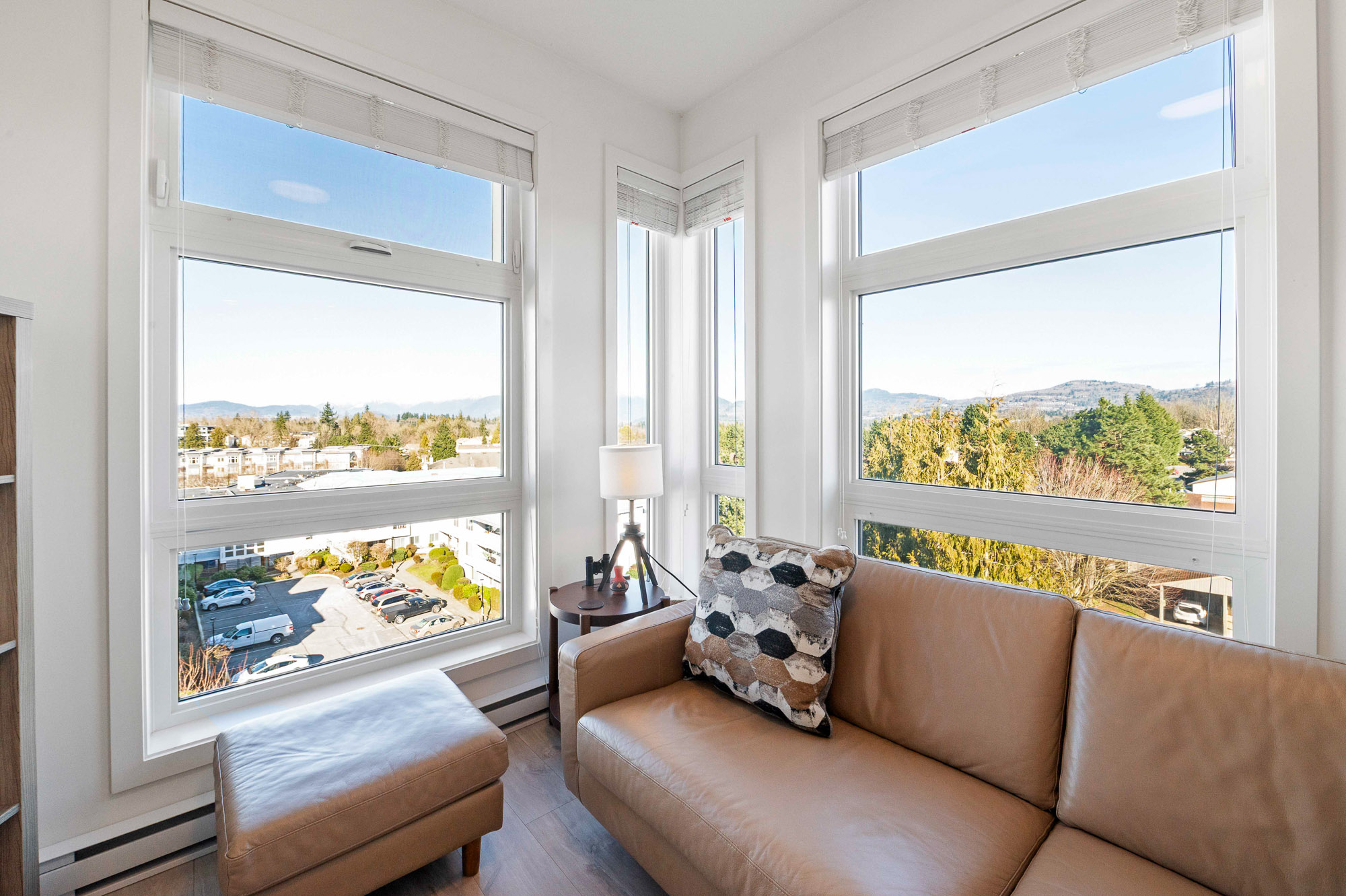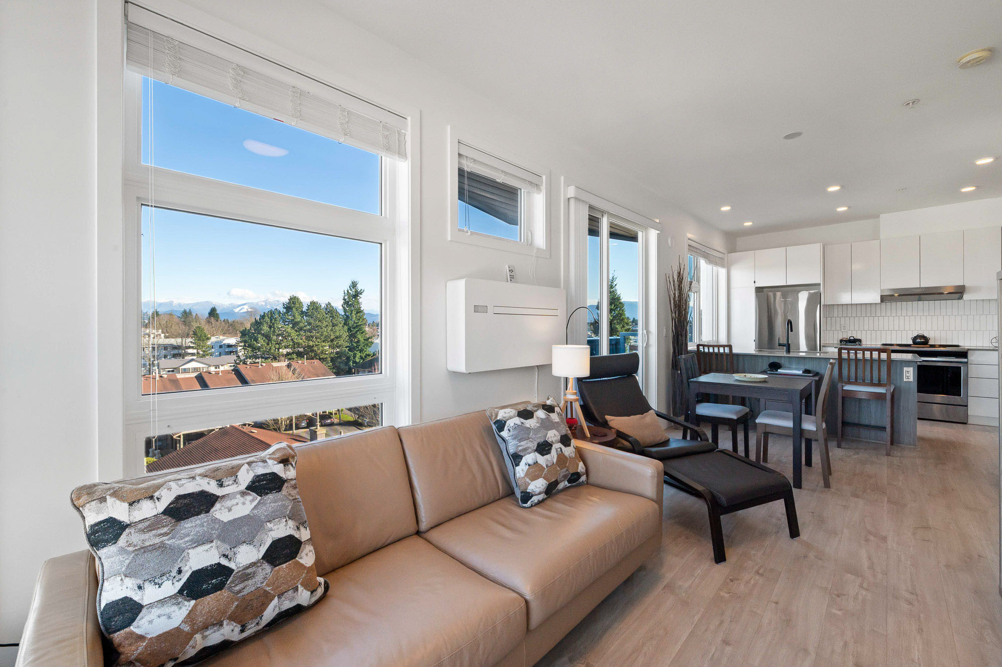Penthouse living at The Court. Stunning Corner Unit with 180+ unobstructed panorama to enjoy your morning coffee. Scenic views from every room of Snow Capped Mountains to Mount Baker and beyond. Enjoy the privacy this of top-floor privacy in this bright 1 bed, 1 bath home with floor-to-ceiling windows, 9' ceilings, and an open-concept 630 sq ft layout. Modern kitchen with quartz countertops, stainless steel appliances and a large island. Brand-new A/C/Heat Pump. Upgraded bath fixtures. Two large, secured parking stalls including EV charger, plus an oversized storage locker. Steps to restaurants, cafes, shopping, transit, recreation, Mill lake, Hospital and Hwy. 1. Ideal for first-time buyers or downsizers. One of Abbotsford's finest one bedroom condos. Don't miss out on this gem.
