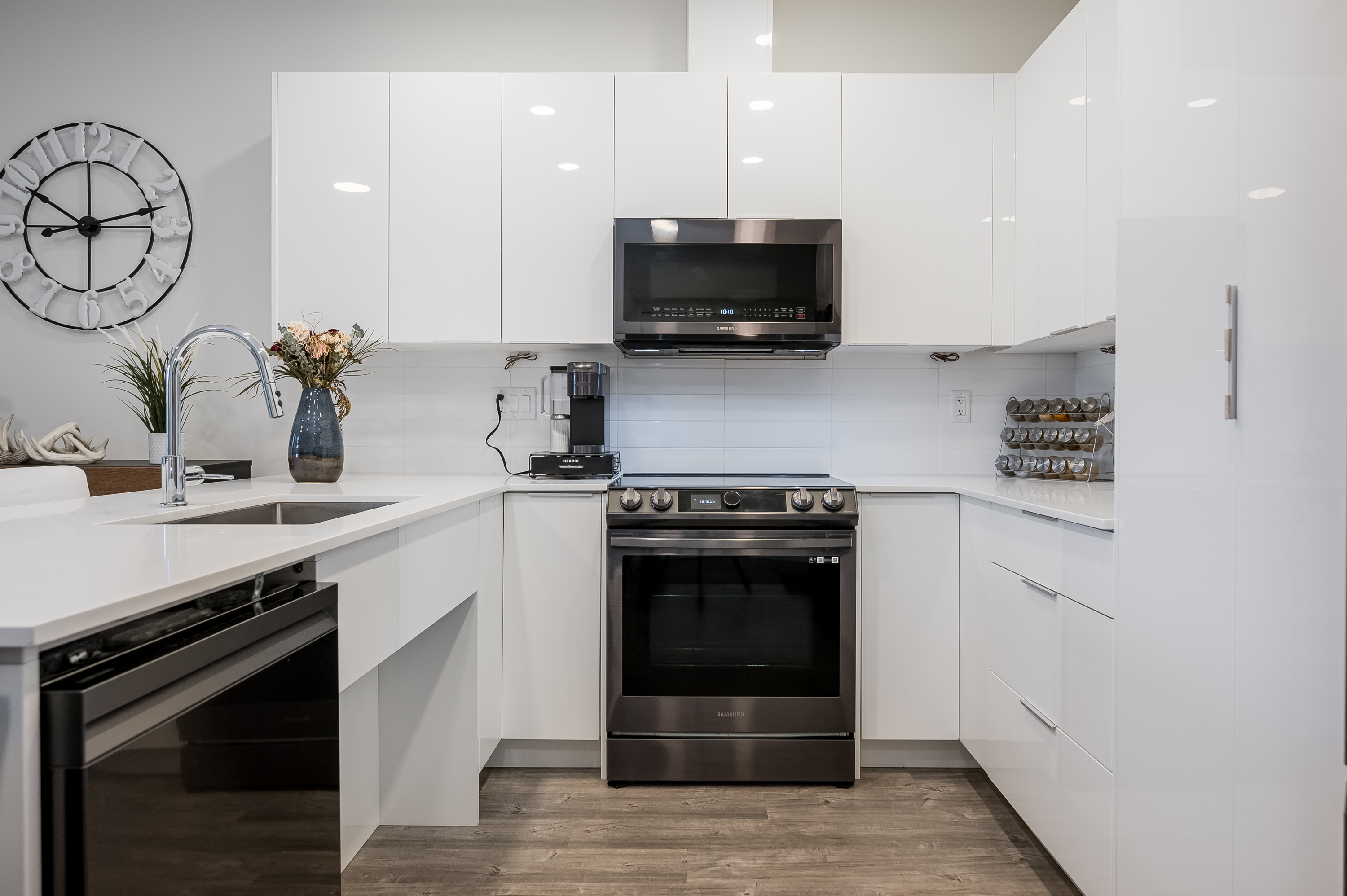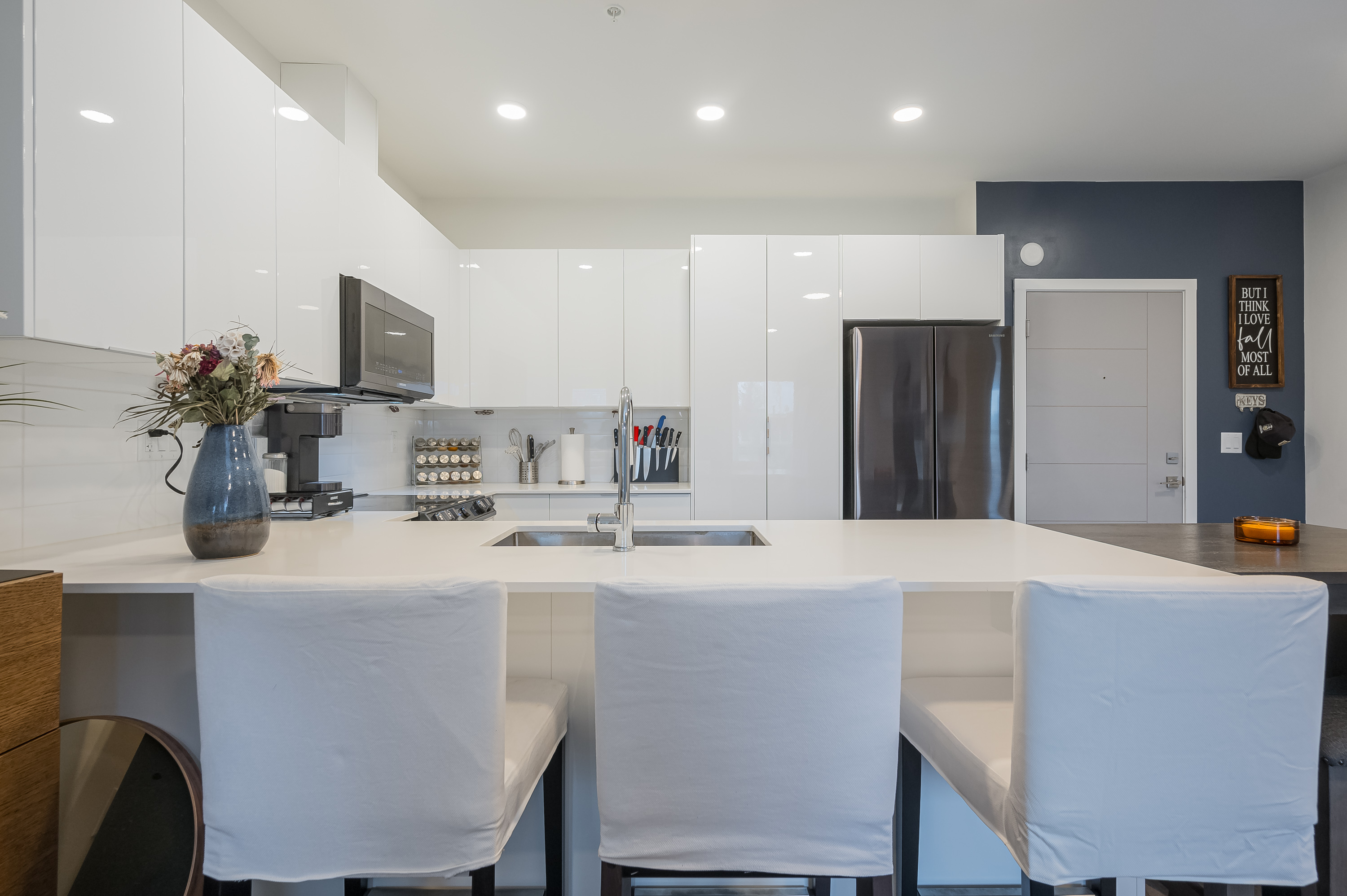 Welcome to The Robson! This beautiful, nearly new 2 bed, 2 bath condo offers a bright, modern layout with stylish finishes throughout. The stunning white kitchen features UPGRADED APPLIANCES, ample cabinetry, and plenty of counter space—perfect for cooking and entertaining. The spacious primary bedroom includes a gorgeous ensuite with double sinks, while the second bedroom and full bath offer flexibility for guests or a home office. Enjoy east-facing views from the patio and large bedroom windows. This home also has the rare BONUS of two secured underground parking stalls. Located in the revitalized downtown core, just a short walk to District 1881, restaurants, shopping, parks, schools and more. Don’t wait to call this one home!