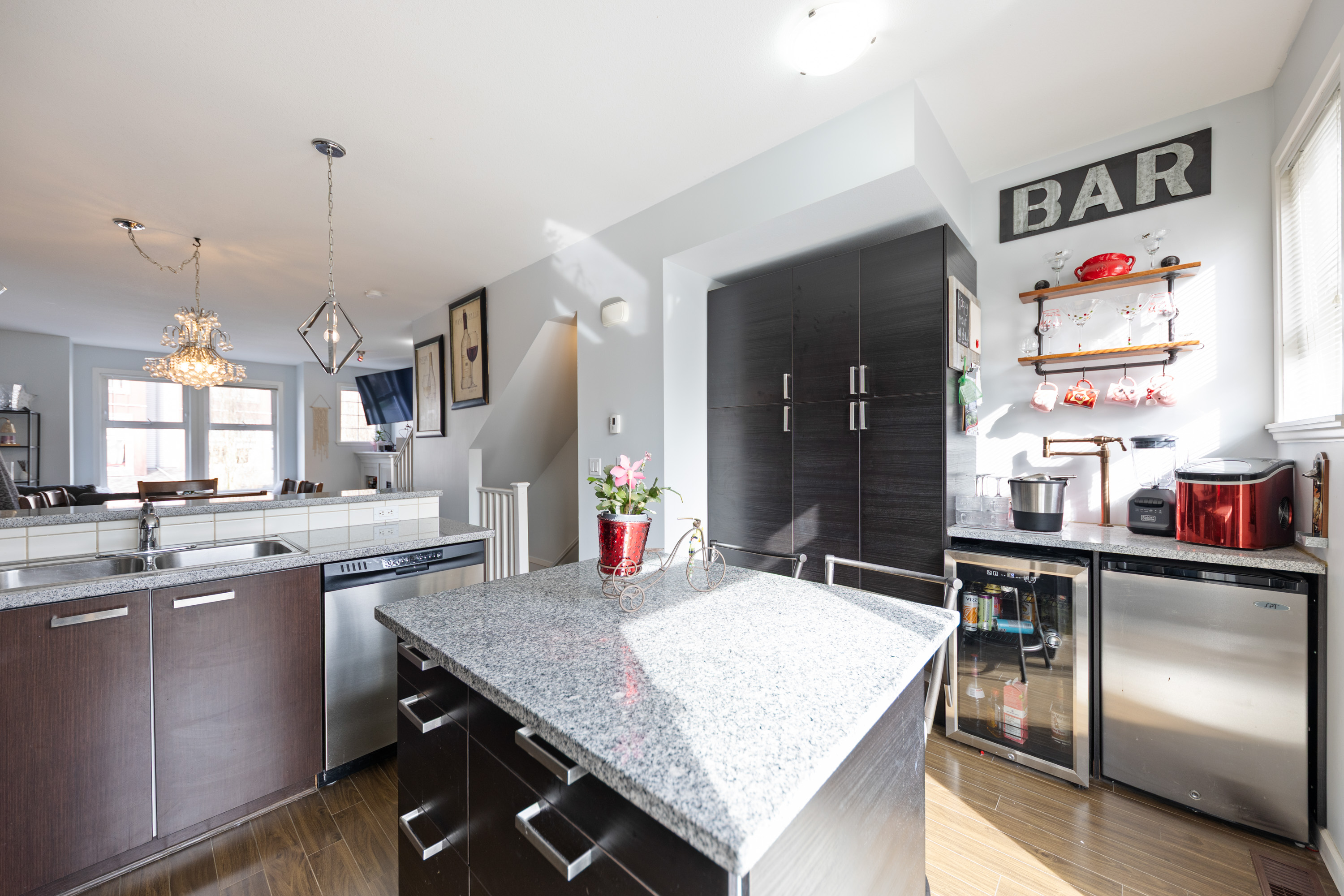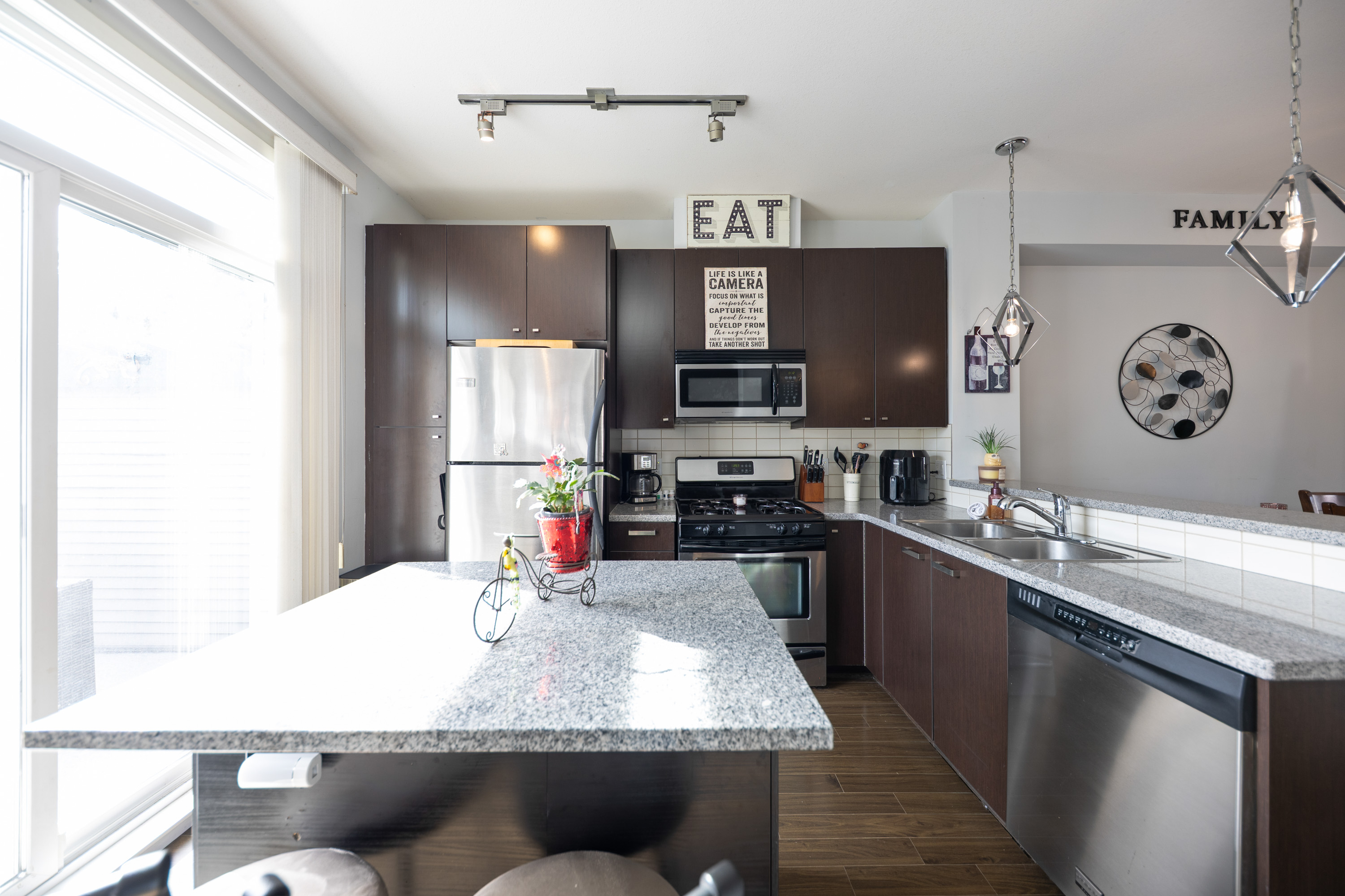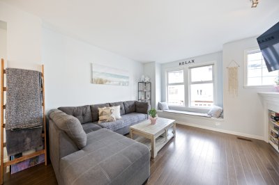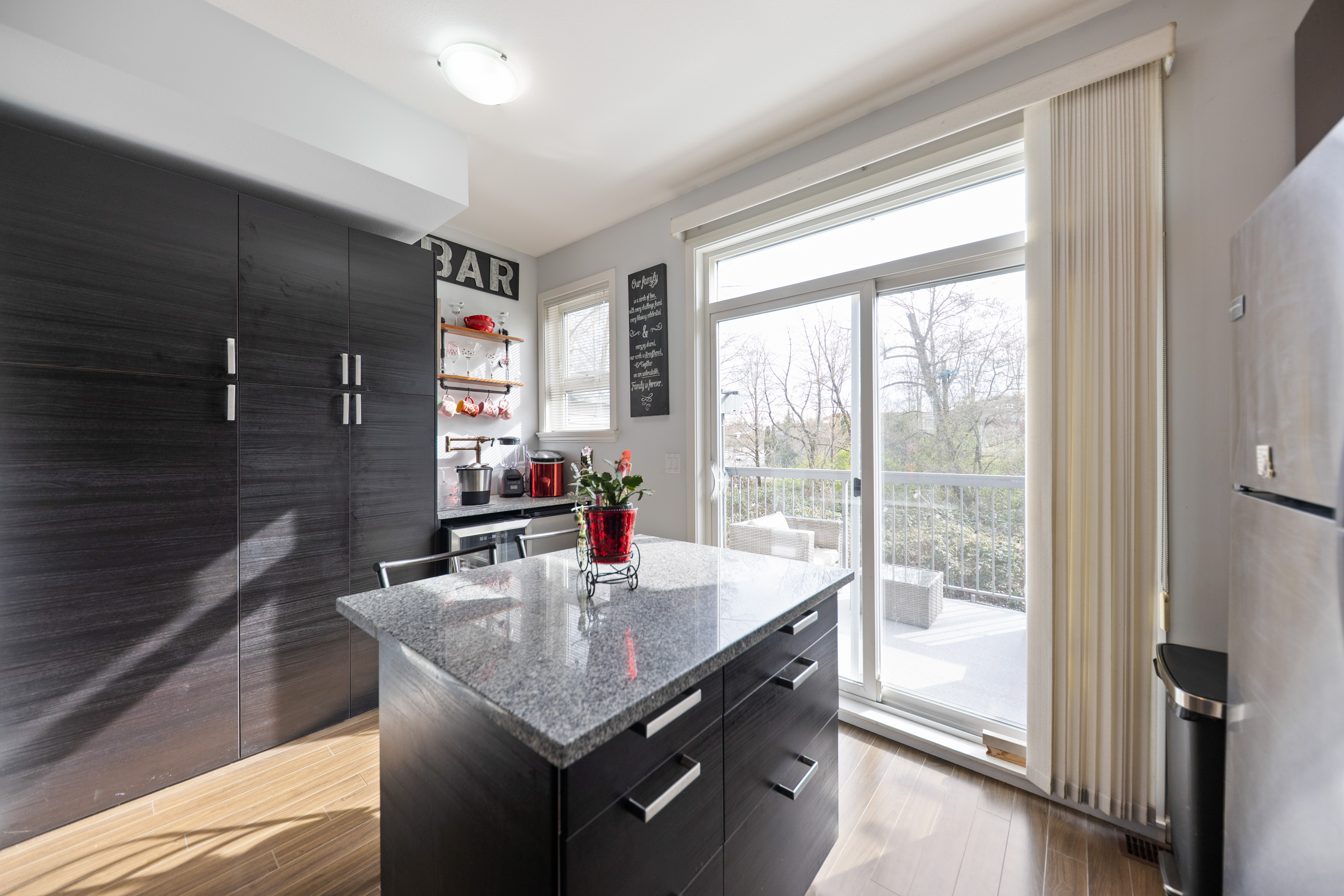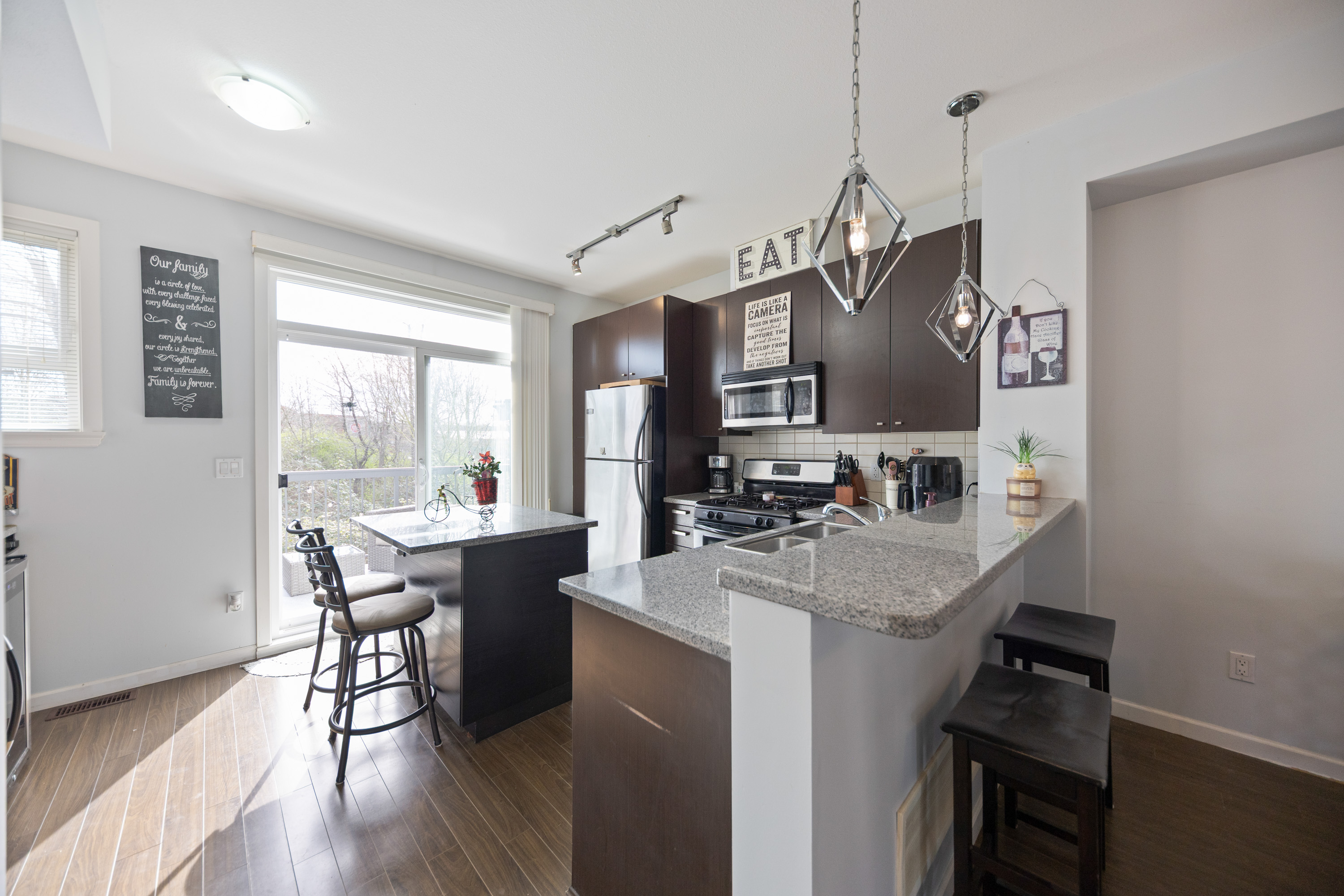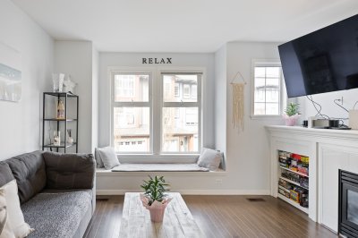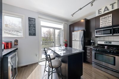 Step into homeownership with this stylish 2 bed, 2 bath townhome at centrally located Compass-perfect for a young couple starting out! Backing onto green space with sunny south exposure, this home offers the ideal mix of comfort and lifestyle. The kitchen shines with espresso cabinetry, granite counters, stainless steel appliances, chef's favourite gas stove plus a custom pantry +bar with unique water faucet. Entertain with ease thanks to a built-in cooler and a custom island with breakfast bar. Enjoy 9’ ceilings, a bright sundeck, cozy gas fireplace, and charming window seats. Upstairs features full-size laundry, a spacious primary with dual closets and a 4-piece ensuite. [Measured by Cotala +/- 2%] Walkable to shops, schools, cafés, parks +future Skytrain. (((Open Sat, Apr 11 @2-4PM)))