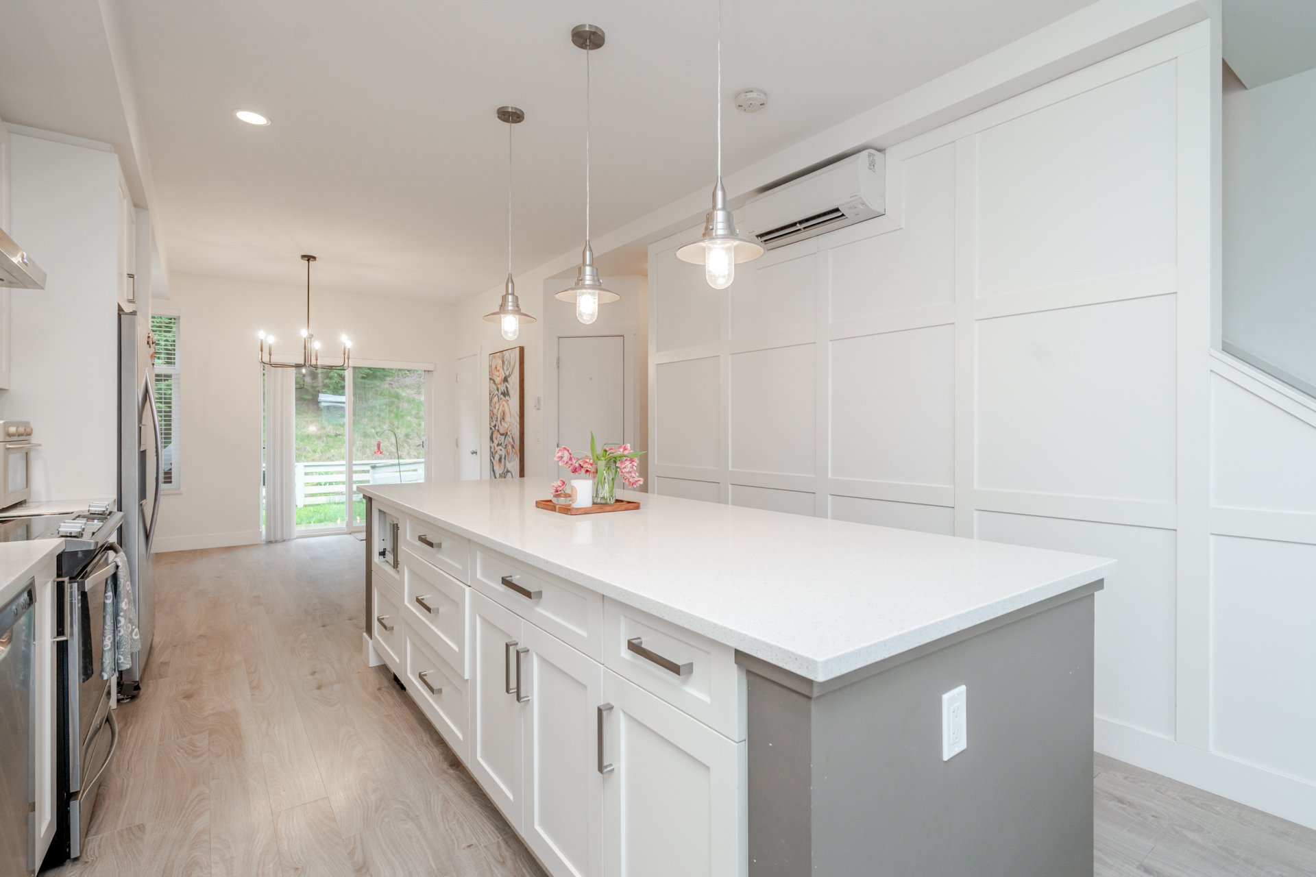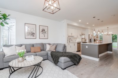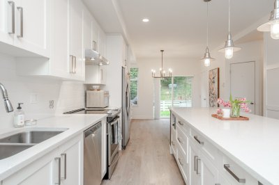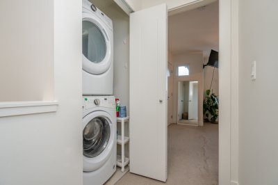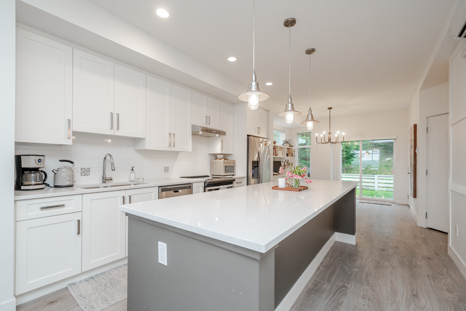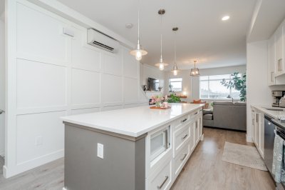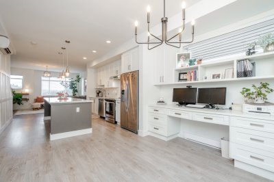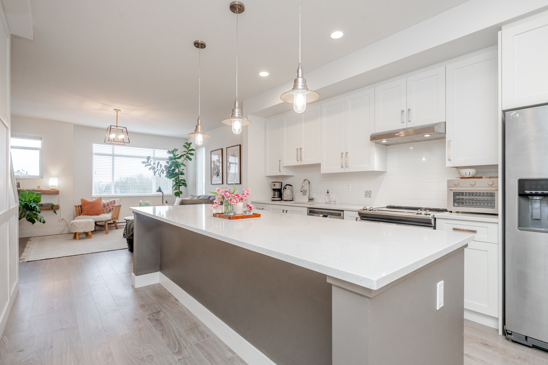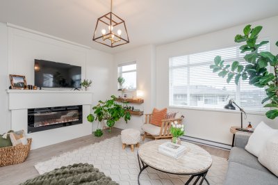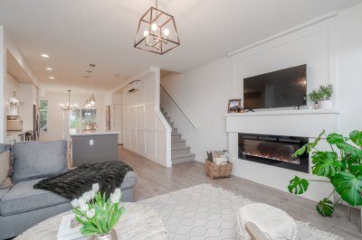 3 bed & 3 bath CORNER UNIT offering a bright open-concept layout with chef-inspired kitchen, large island, gas range, stainless steel appliances, built-in microwave, and quartz counters. Forced air heating and A/C for year-round comfort. Walk out to your yard with patio and gas hookup for BBQ or fire table. Upgrades include custom fireplace, designer built-in office with full-length workstation and custom cabinetry, undermount sinks, spa-inspired ensuite with frameless glass shower, and new washer & dryer. Extra windows bring in abundant natural light, with no units directly in front or behind for added privacy. Includes 3 parking and flexible garage space. Family-friendly complex with playground and community garden. Situated in a highly sought-after school catchment
