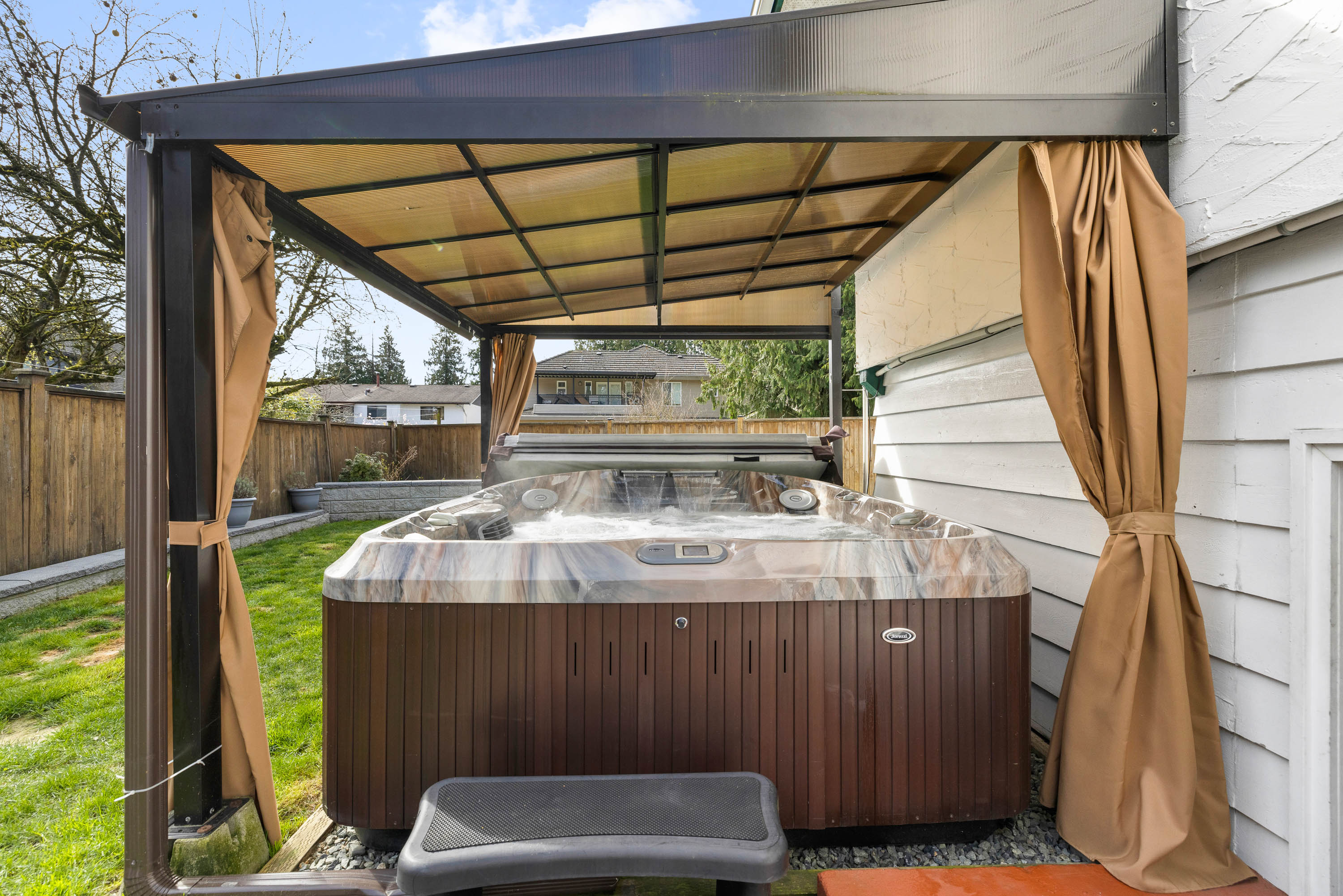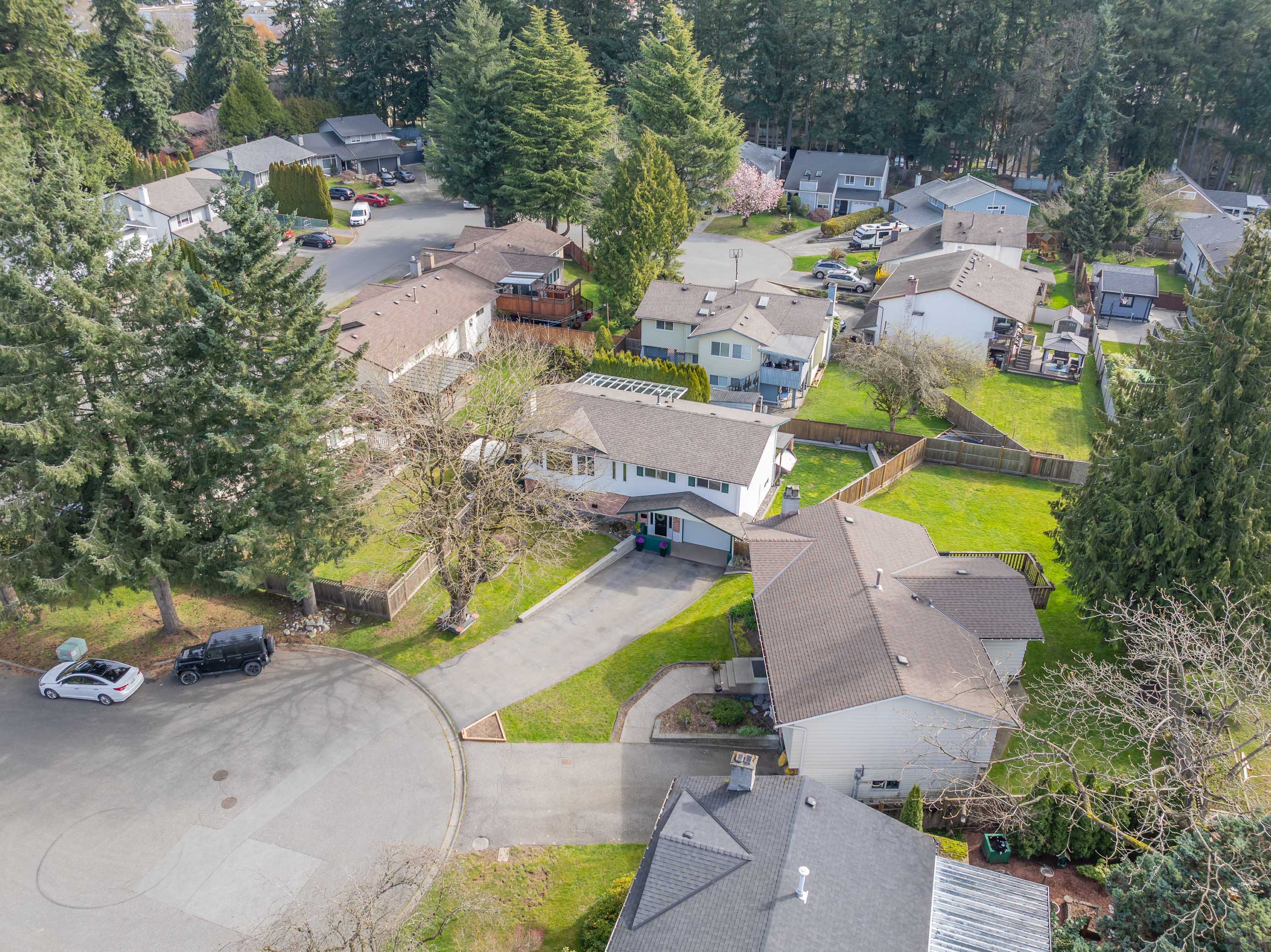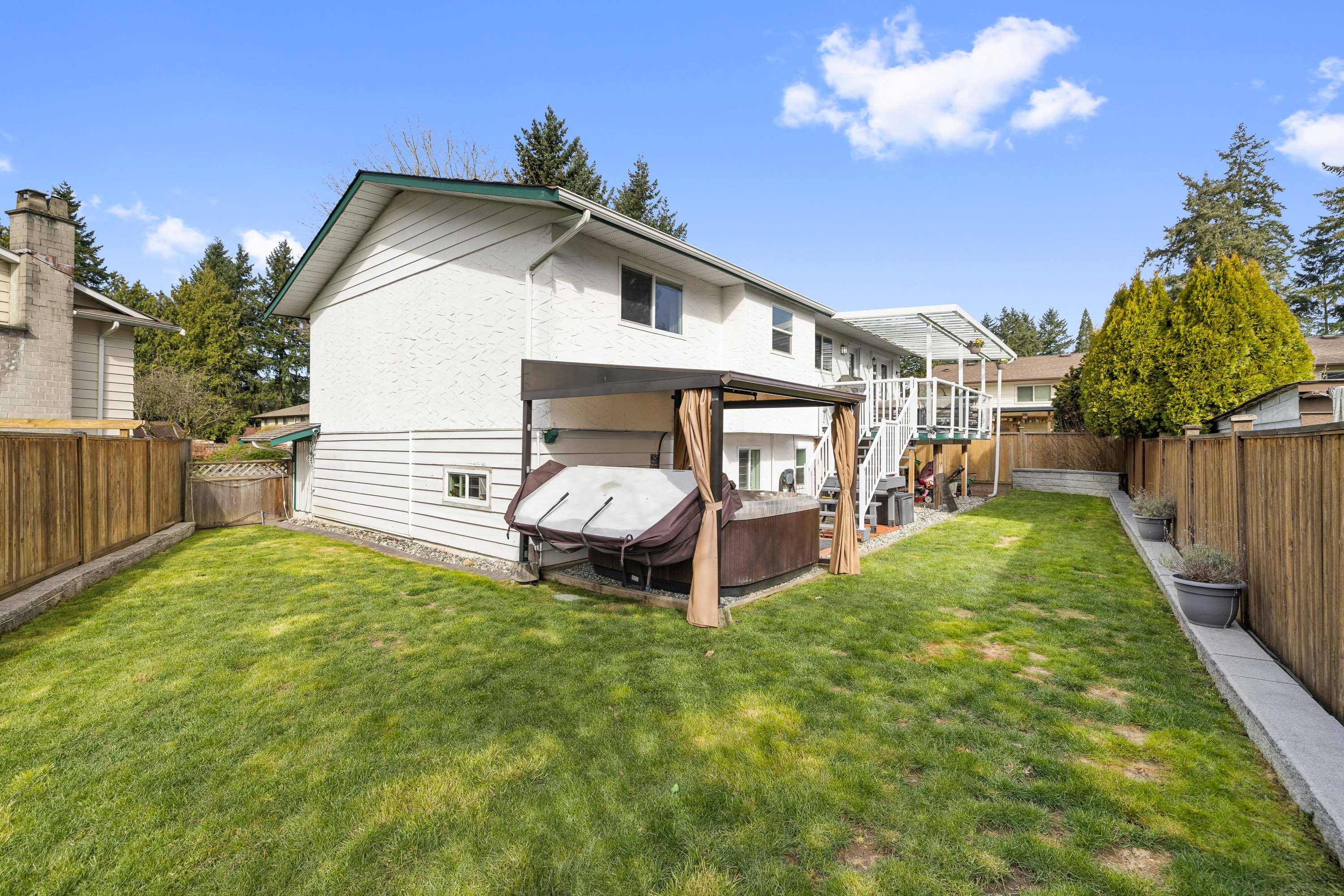 First time on the market in over 20 years! Tucked in a quiet family-friendly cul-de-sac this well-maintained home is MOVE-IN READY! Main floor features large foyer, media/rec room + den (or bdrm), laundry room, new bathroom w/shower & a single garage. Upstairs has a bright living room w/cozy wood-burning fireplace, Hunter Douglas blinds, crown molding, large dining area, updated kitchen w/quartz counters & SS appliances. PRIVATE heated, covered deck w/gas hookup - great for entertaining! Updated family bath w/ heated floors, large primary bdrm w/custom closets & ensuite w/heated floors, plus 2 other good-sized bdrms. Private backyard w/jacuzzi hot tub – so relaxing! New roof & windows in 2016. Irrigation system! All this & just steps to transit, shopping & schools - perfect for the family!