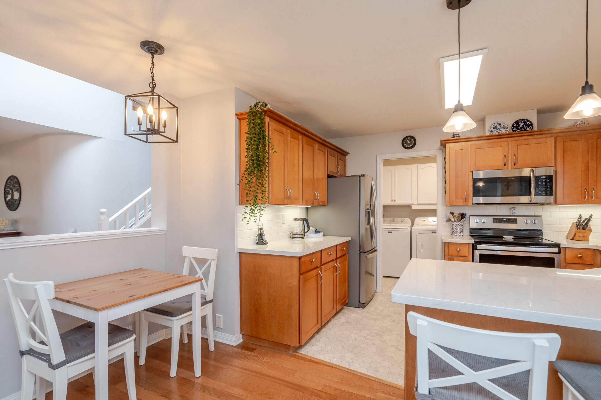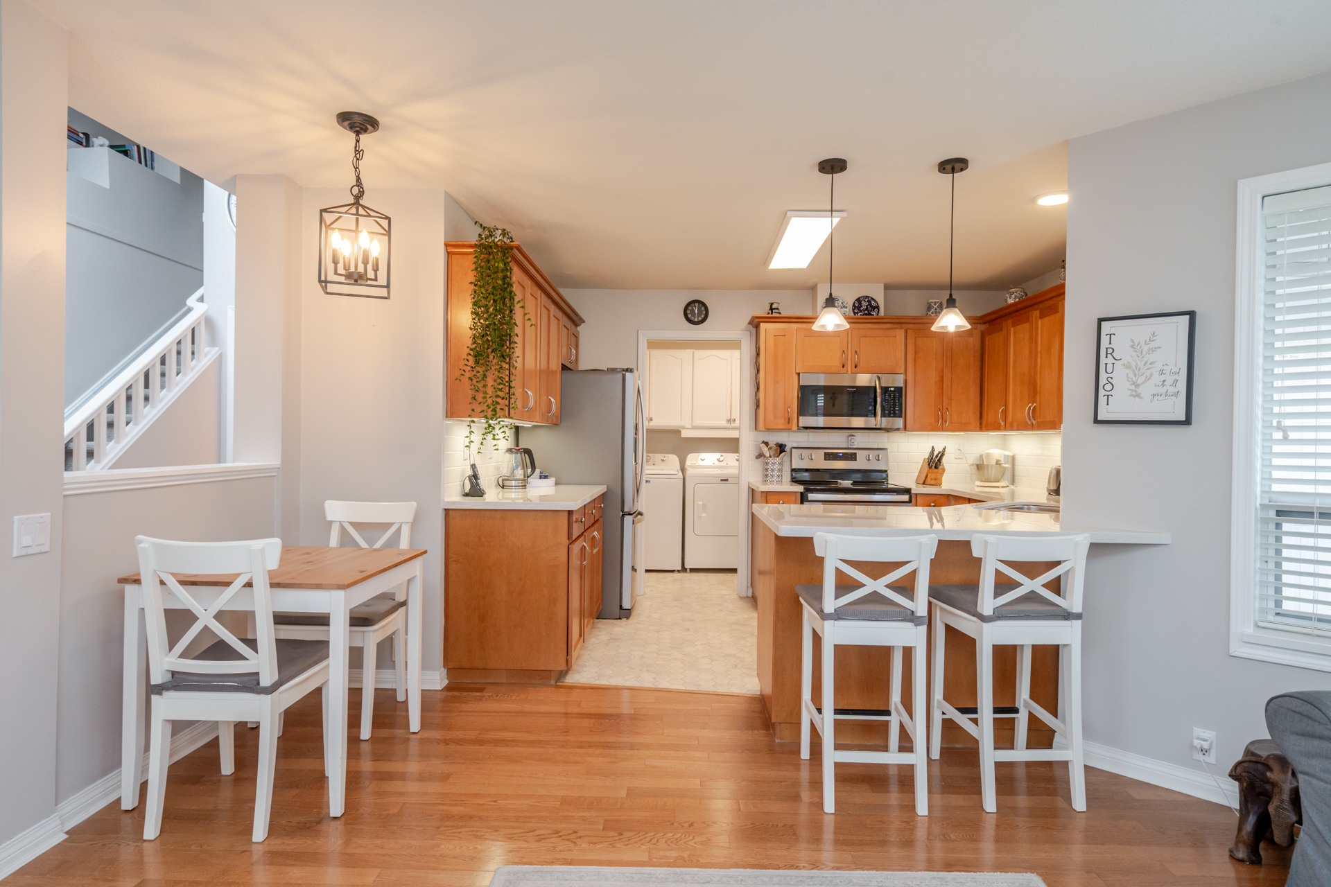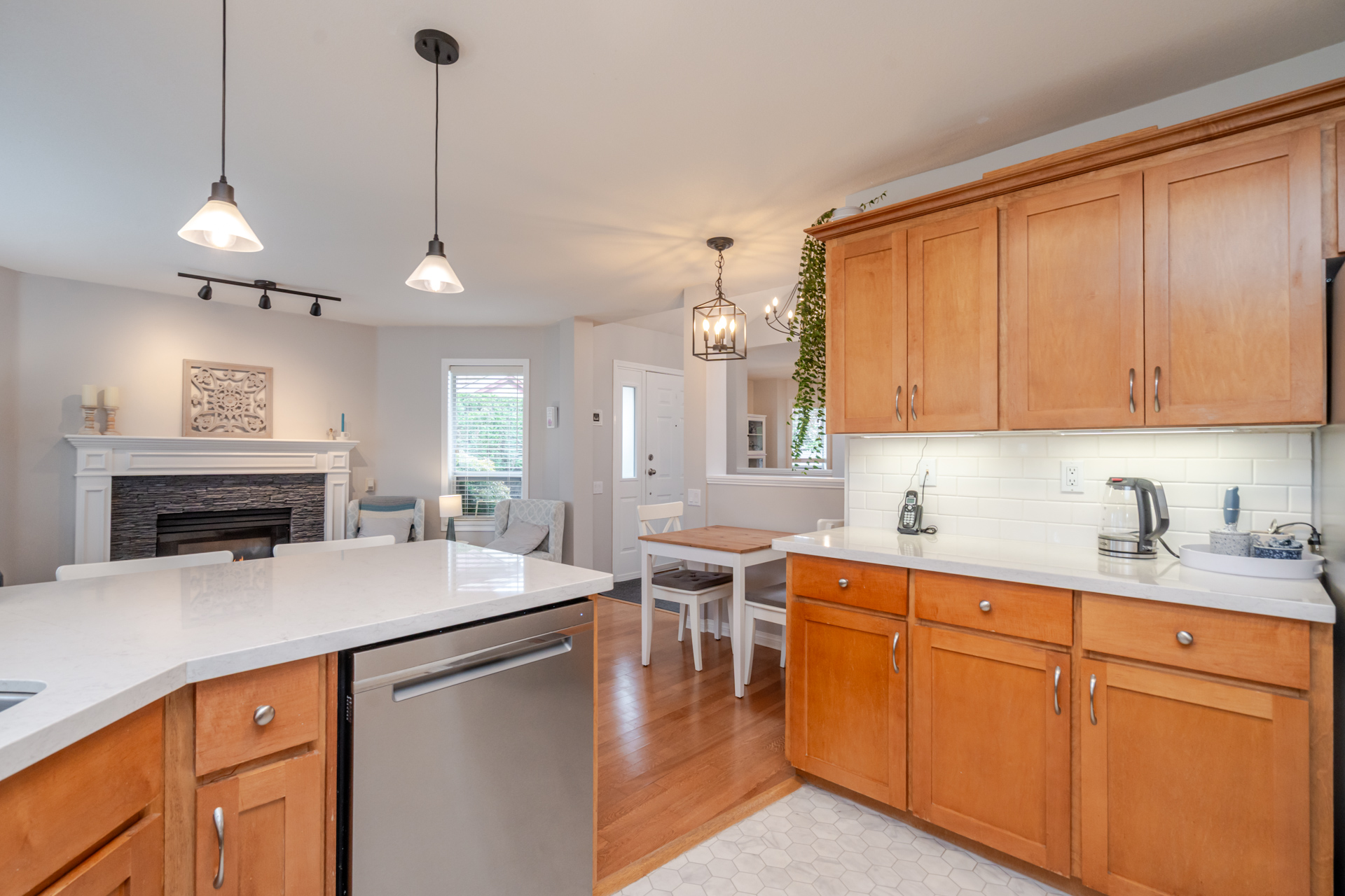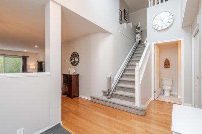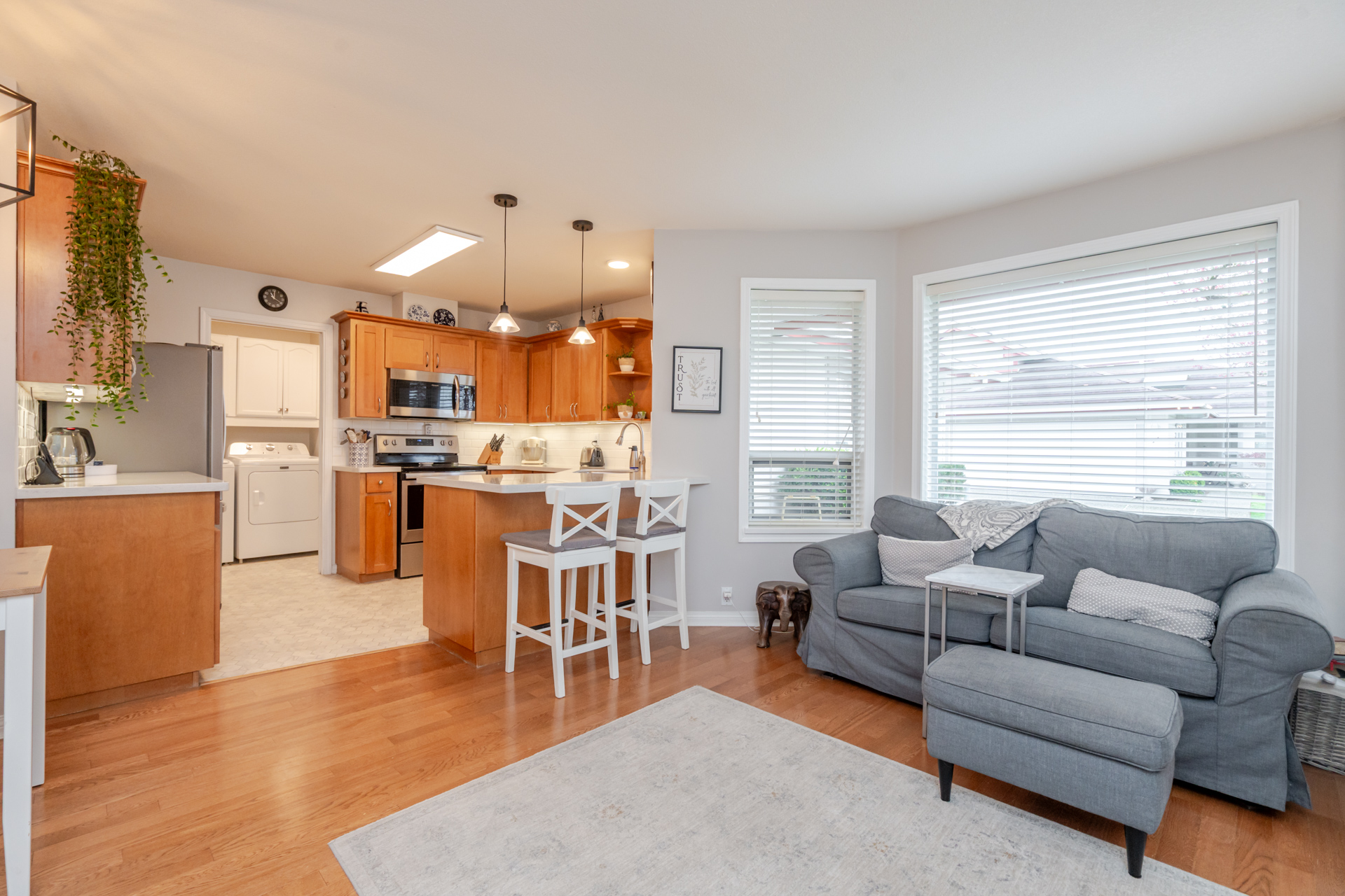 Welcome to Elwood Estates, a well-maintained gated townhouse community in Abbotsford. This updated 3-bed, 3 bath home features a stylish updated kitchen with Whirlpool stainless steel appliances, maple cabinetry, and Silestone quartz countertops throughout, including the bathrooms. The open-concept main floor offers bright living and dining spaces, a cozy family room with gas fireplace, and a spacious primary bedroom with walk-in closet and 5-piece ensuite. Upstairs features two large bedrooms and a versatile landing which could be a small library. Additional highlights include main floor laundry, updated lighting, and an energy-efficient Bosch on-demand system for in-floor heating and continuous hot water. Well-appointed complex with clubhouse, fitness area, and social spaces.